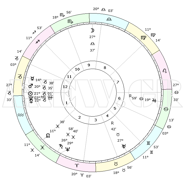 | | ΘΕΣΕΙΣ ΠΛΑΝΗΤΩΝ ΑΣΤΡΟΛΟΓΙΚΟΥ ΧΑΡΤΗ ΤΗΣ ΣΤΙΓΜΗΣ ΑΥΤΗΣ | | | | Πλανήτης | Ζώδιο | Μοίρες | Δεκαήμ. | Σε οίκο | Απόκλιση | | Ακμές των οίκων | | Ηλιος | Αιγόκερως | 20°28' | Τρίτο | 6 | 21 S 53 | | 1ος | 09°60' | Λέων | | Σελήνη | Ζυγός | 20°59' | Τρίτο | 3 | 11 S 17 | | 2ος | 01°50' | Παρθένος | | Ερμής | Αιγόκερως | 13°46' | Δεύτερο | 6 | 24 S 12 | | 3ος | 28°13' | Παρθένος | | Αφροδίτη | Αιγόκερως | 21°26' | Τρίτο | 6 | 22 S 34 | | 4ος | 00°17' | Σκορπιός | | Αρης | Αιγόκερως | 20°10' | Τρίτο | 6 | 22 S 51 | | 5ος | 05°54' | Τοξότης | | Δίας | Καρκίνος | 20°03'R | Τρίτο | 12 | 22 N 12 | | 6ος | 10°03' | Αιγόκερως | | Κρόνος | Ιχθείς | 26°55' | Τρίτο | 8 | 03 S 16 | | 7ος | 09°60' | Υδροχόος | | Ουρανός | Ταύρος | 27°43'R | Τρίτο | 10 | 19 N 27 | | 8ος | 01°50' | Ιχθείς | | Ποσειδώνας | Ιχθείς | 29°39' | Τρίτο | 9 | 01 S 21 | | 9ος | 28°13' | Ιχθείς | | Πλούτωνας | Υδροχόος | 03°01' | Πρώτο | 6 | 23 S 09 | | 10ος | 00°17' | Ταύρος | | Β. Δεσμός | Ιχθείς | 11°39' | Δεύτερο | 8 | 07 S 11 | | 11ος | 05°54' | Δίδυμοι | | Ωροσκόπος | Λέων | 09°60' | Πρώτο | | | 12ος | 10°03' | Καρκίνος | | Μεσουράνημα | Ταύρος | 00°17' | Πρώτο | | | |