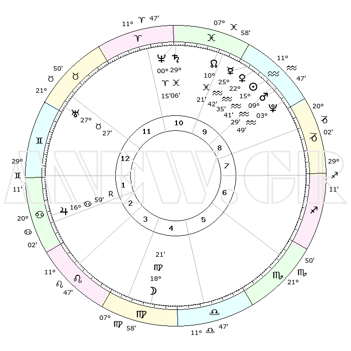 | | ΘΕΣΕΙΣ ΠΛΑΝΗΤΩΝ ΑΣΤΡΟΛΟΓΙΚΟΥ ΧΑΡΤΗ ΤΗΣ ΣΤΙΓΜΗΣ ΑΥΤΗΣ | | | | Πλανήτης | Ζώδιο | Μοίρες | Δεκαήμ. | Σε οίκο | Απόκλιση | | Ακμές των οίκων | | Ηλιος | Υδροχόος | 15°36' | Δεύτερο | 10 | 16 S 09 | | 1ος | 29°52' | Ταύρος | | Σελήνη | Παρθένος | 17°19' | Δεύτερο | 5 | 04 N 19 | | 2ος | 24°42' | Δίδυμοι | | Ερμής | Υδροχόος | 25°33' | Τρίτο | 10 | 14 S 31 | | 3ος | 16°07' | Καρκίνος | | Αφροδίτη | Υδροχόος | 22°29' | Τρίτο | 10 | 15 S 21 | | 4ος | 08°52' | Λέων | | Αρης | Υδροχόος | 09°25' | Πρώτο | 10 | 18 S 54 | | 5ος | 07°19' | Παρθένος | | Δίας | Καρκίνος | 16°59'R | Δεύτερο | 3 | 22 N 40 | | 6ος | 15°44' | Ζυγός | | Κρόνος | Ιχθείς | 29°06' | Τρίτο | 11 | 02 S 21 | | 7ος | 29°52' | Σκορπιός | | Ουρανός | Ταύρος | 27°27' | Τρίτο | 12 | 19 N 24 | | 8ος | 24°42' | Τοξότης | | Ποσειδώνας | Κριός | 00°14' | Πρώτο | 11 | 01 S 07 | | 9ος | 16°07' | Αιγόκερως | | Πλούτωνας | Υδροχόος | 03°49' | Πρώτο | 9 | 23 S 00 | | 10ος | 08°52' | Υδροχόος | | Β. Δεσμός | Ιχθείς | 10°21' | Δεύτερο | 11 | 07 S 41 | | 11ος | 07°19' | Ιχθείς | | Ωροσκόπος | Ταύρος | 29°52' | Τρίτο | | | 12ος | 15°44' | Κριός | | Μεσουράνημα | Υδροχόος | 08°52' | Πρώτο | | | |