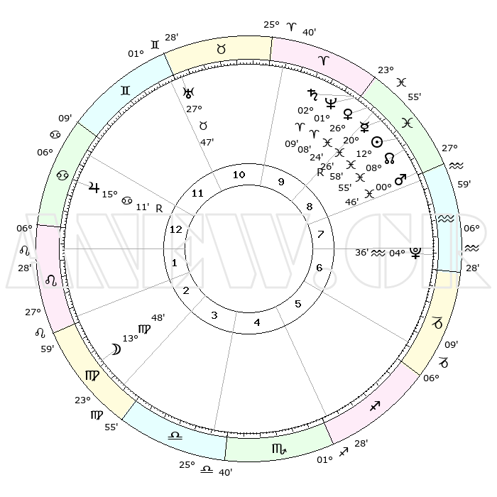 | | ΘΕΣΕΙΣ ΠΛΑΝΗΤΩΝ ΑΣΤΡΟΛΟΓΙΚΟΥ ΧΑΡΤΗ ΤΗΣ ΣΤΙΓΜΗΣ ΑΥΤΗΣ | | | | Πλανήτης | Ζώδιο | Μοίρες | Δεκαήμ. | Σε οίκο | Απόκλιση | | Ακμές των οίκων | | Ηλιος | Ιχθείς | 12°54' | Δεύτερο | 9 | 06 S 43 | | 1ος | 17°12' | Καρκίνος | | Σελήνη | Παρθένος | 12°56' | Δεύτερο | 3 | 06 N 22 | | 2ος | 07°40' | Λέων | | Ερμής | Ιχθείς | 20°29'R | Τρίτο | 9 | 00 S 28 | | 3ος | 01°05' | Παρθένος | | Αφροδίτη | Ιχθείς | 26°19' | Τρίτο | 9 | 02 S 40 | | 4ος | 00°15' | Ζυγός | | Αρης | Ιχθείς | 00°43' | Πρώτο | 8 | 12 S 15 | | 5ος | 06°06' | Σκορπιός | | Δίας | Καρκίνος | 15°11'R | Δεύτερο | 12 | 22 N 55 | | 6ος | 13°58' | Τοξότης | | Κρόνος | Κριός | 02°08' | Πρώτο | 10 | 01 S 06 | | 7ος | 17°12' | Αιγόκερως | | Ουρανός | Ταύρος | 27°47' | Τρίτο | 11 | 19 N 29 | | 8ος | 07°41' | Υδροχόος | | Ποσειδώνας | Κριός | 01°08' | Πρώτο | 10 | 00 S 45 | | 9ος | 01°05' | Ιχθείς | | Πλούτωνας | Υδροχόος | 04°36' | Πρώτο | 7 | 22 S 52 | | 10ος | 00°15' | Κριός | | Β. Δεσμός | Ιχθείς | 08°55' | Πρώτο | 9 | 08 S 14 | | 11ος | 06°06' | Ταύρος | | Ωροσκόπος | Καρκίνος | 17°12' | Δεύτερο | | | 12ος | 13°58' | Δίδυμοι | | Μεσουράνημα | Κριός | 00°15' | Πρώτο | | | |