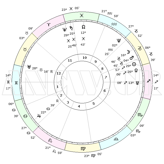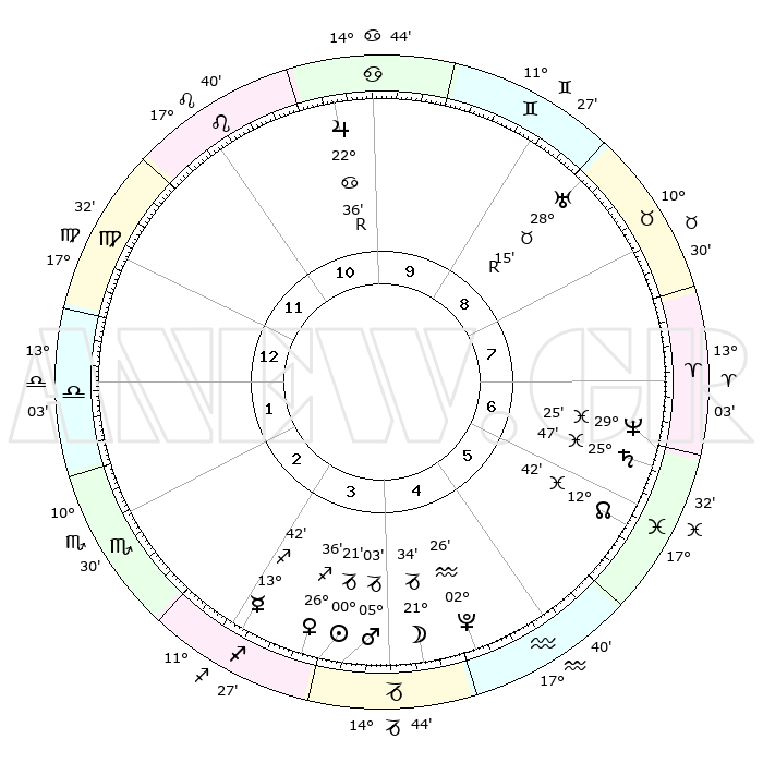 | | ΘΕΣΕΙΣ ΠΛΑΝΗΤΩΝ ΑΣΤΡΟΛΟΓΙΚΟΥ ΧΑΡΤΗ ΤΗΣ ΣΤΙΓΜΗΣ ΑΥΤΗΣ | | | | Πλανήτης | Ζώδιο | Μοίρες | Δεκαήμ. | Σε οίκο | Απόκλιση | | Ακμές των οίκων | | Ηλιος | Τοξότης | 29°53' | Τρίτο | 8 | 23 S 26 | | 1ος | 14°02' | Ταύρος | | Σελήνη | Αιγόκερως | 15°54' | Δεύτερο | 9 | 26 S 36 | | 2ος | 12°31' | Δίδυμοι | | Ερμής | Τοξότης | 13°02' | Δεύτερο | 8 | 21 S 40 | | 3ος | 04°49' | Καρκίνος | | Αφροδίτη | Τοξότης | 26°01' | Τρίτο | 8 | 23 S 28 | | 4ος | 26°45' | Καρκίνος | | Αρης | Αιγόκερως | 04°42' | Πρώτο | 8 | 24 S 10 | | 5ος | 22°46' | Λέων | | Δίας | Καρκίνος | 22°39'R | Τρίτο | 3 | 21 N 44 | | 6ος | 28°18' | Παρθένος | | Κρόνος | Ιχθείς | 25°46' | Τρίτο | 11 | 03 S 47 | | 7ος | 14°02' | Σκορπιός | | Ουρανός | Ταύρος | 28°16'R | Τρίτο | 1 | 19 N 34 | | 8ος | 12°31' | Τοξότης | | Ποσειδώνας | Ιχθείς | 29°24' | Τρίτο | 12 | 01 S 28 | | 9ος | 04°49' | Αιγόκερως | | Πλούτωνας | Υδροχόος | 02°25' | Πρώτο | 10 | 23 S 17 | | 10ος | 26°45' | Αιγόκερως | | Β. Δεσμός | Ιχθείς | 12°44' | Δεύτερο | 11 | 06 S 47 | | 11ος | 22°46' | Υδροχόος | | Ωροσκόπος | Ταύρος | 14°02' | Δεύτερο | | | 12ος | 28°18' | Ιχθείς | | Μεσουράνημα | Αιγόκερως | 26°45' | Τρίτο | | | |