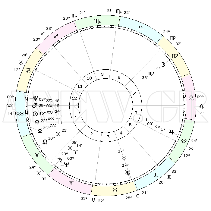 | | ΘΕΣΕΙΣ ΠΛΑΝΗΤΩΝ ΑΣΤΡΟΛΟΓΙΚΟΥ ΧΑΡΤΗ ΤΗΣ ΣΤΙΓΜΗΣ ΑΥΤΗΣ | | | | Πλανήτης | Ζώδιο | Μοίρες | Δεκαήμ. | Σε οίκο | Απόκλιση | | Ακμές των οίκων | | Ηλιος | Υδροχόος | 15°44' | Δεύτερο | 8 | 16 S 07 | | 1ος | 14°26' | Καρκίνος | | Σελήνη | Παρθένος | 18°59' | Δεύτερο | 3 | 03 N 31 | | 2ος | 04°51' | Λέων | | Ερμής | Υδροχόος | 25°47' | Τρίτο | 8 | 14 S 26 | | 3ος | 27°56' | Λέων | | Αφροδίτη | Υδροχόος | 22°39' | Τρίτο | 8 | 15 S 18 | | 4ος | 26°39' | Παρθένος | | Αρης | Υδροχόος | 09°31' | Πρώτο | 8 | 18 S 53 | | 5ος | 02°20' | Σκορπιός | | Δίας | Καρκίνος | 16°58'R | Δεύτερο | 1 | 22 N 40 | | 6ος | 10°37' | Τοξότης | | Κρόνος | Ιχθείς | 29°07' | Τρίτο | 10 | 02 S 20 | | 7ος | 14°26' | Αιγόκερως | | Ουρανός | Ταύρος | 27°27' | Τρίτο | 11 | 19 N 24 | | 8ος | 04°51' | Υδροχόος | | Ποσειδώνας | Κριός | 00°15' | Πρώτο | 10 | 01 S 06 | | 9ος | 27°56' | Υδροχόος | | Πλούτωνας | Υδροχόος | 03°49' | Πρώτο | 7 | 23 S 00 | | 10ος | 26°39' | Ιχθείς | | Β. Δεσμός | Ιχθείς | 10°20' | Δεύτερο | 9 | 07 S 41 | | 11ος | 02°20' | Ταύρος | | Ωροσκόπος | Καρκίνος | 14°26' | Δεύτερο | | | 12ος | 10°37' | Δίδυμοι | | Μεσουράνημα | Ιχθείς | 26°39' | Τρίτο | | | |