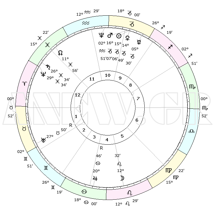 | | ΘΕΣΕΙΣ ΠΛΑΝΗΤΩΝ ΑΣΤΡΟΛΟΓΙΚΟΥ ΧΑΡΤΗ ΤΗΣ ΣΤΙΓΜΗΣ ΑΥΤΗΣ | | | | Πλανήτης | Ζώδιο | Μοίρες | Δεκαήμ. | Σε οίκο | Απόκλιση | | Ακμές των οίκων | | Ηλιος | Αιγόκερως | 15°03' | Δεύτερο | 10 | 22 S 35 | | 1ος | 05°39' | Κριός | | Σελήνη | Λέων | 11°55' | Δεύτερο | 5 | 19 N 33 | | 2ος | 14°32' | Ταύρος | | Ερμής | Αιγόκερως | 05°26' | Πρώτο | 10 | 24 S 21 | | 3ος | 11°06' | Δίδυμοι | | Αφροδίτη | Αιγόκερως | 14°45' | Δεύτερο | 10 | 23 S 17 | | 4ος | 03°11' | Καρκίνος | | Αρης | Αιγόκερως | 16°05' | Δεύτερο | 10 | 23 S 23 | | 5ος | 25°45' | Καρκίνος | | Δίας | Καρκίνος | 20°46'R | Τρίτο | 4 | 22 N 04 | | 6ος | 24°03' | Λέων | | Κρόνος | Ιχθείς | 26°33' | Τρίτο | 12 | 03 S 26 | | 7ος | 05°39' | Ζυγός | | Ουρανός | Ταύρος | 27°50'R | Τρίτο | 2 | 19 N 29 | | 8ος | 14°32' | Σκορπιός | | Ποσειδώνας | Ιχθείς | 29°34' | Τρίτο | 12 | 01 S 24 | | 9ος | 11°06' | Τοξότης | | Πλούτωνας | Υδροχόος | 02°51' | Πρώτο | 11 | 23 S 11 | | 10ος | 03°11' | Αιγόκερως | | Β. Δεσμός | Ιχθείς | 11°56' | Δεύτερο | 12 | 07 S 05 | | 11ος | 25°45' | Αιγόκερως | | Ωροσκόπος | Κριός | 05°39' | Πρώτο | | | 12ος | 24°03' | Υδροχόος | | Μεσουράνημα | Αιγόκερως | 03°11' | Πρώτο | | | |