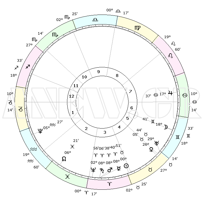 | | ΘΕΣΕΙΣ ΠΛΑΝΗΤΩΝ ΑΣΤΡΟΛΟΓΙΚΟΥ ΧΑΡΤΗ ΤΗΣ ΣΤΙΓΜΗΣ ΑΥΤΗΣ | | | | Πλανήτης | Ζώδιο | Μοίρες | Δεκαήμ. | Σε οίκο | Απόκλιση | | Ακμές των οίκων | | Ηλιος | Κριός | 29°60' | Τρίτο | 2 | 11 N 28 | | 1ος | 00°26' | Ιχθείς | | Σελήνη | Δίδυμοι | 05°35' | Πρώτο | 3 | 26 N 15 | | 2ος | 15°49' | Κριός | | Ερμής | Κριός | 07°17' | Πρώτο | 1 | 00 N 29 | | 3ος | 18°27' | Ταύρος | | Αφροδίτη | Ταύρος | 25°00' | Τρίτο | 3 | 19 N 24 | | 4ος | 12°48' | Δίδυμοι | | Αρης | Κριός | 07°57' | Πρώτο | 1 | 02 N 17 | | 5ος | 04°29' | Καρκίνος | | Δίας | Καρκίνος | 17°31' | Δεύτερο | 5 | 22 N 40 | | 6ος | 28°05' | Καρκίνος | | Κρόνος | Κριός | 07°59' | Πρώτο | 1 | 01 N 12 | | 7ος | 00°26' | Παρθένος | | Ουρανός | Ταύρος | 29°41' | Τρίτο | 3 | 19 N 55 | | 8ος | 15°49' | Ζυγός | | Ποσειδώνας | Κριός | 02°54' | Πρώτο | 1 | 00 S 03 | | 9ος | 18°27' | Σκορπιός | | Πλούτωνας | Υδροχόος | 05°27' | Πρώτο | 12 | 22 S 48 | | 10ος | 12°48' | Τοξότης | | Β. Δεσμός | Ιχθείς | 06°24' | Πρώτο | 1 | 09 S 10 | | 11ος | 04°29' | Αιγόκερως | | Ωροσκόπος | Ιχθείς | 00°26' | Πρώτο | | | 12ος | 28°05' | Αιγόκερως | | Μεσουράνημα | Τοξότης | 12°48' | Δεύτερο | | | |