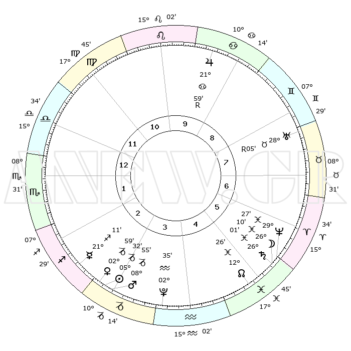 | | ΘΕΣΕΙΣ ΠΛΑΝΗΤΩΝ ΑΣΤΡΟΛΟΓΙΚΟΥ ΧΑΡΤΗ ΤΗΣ ΣΤΙΓΜΗΣ ΑΥΤΗΣ | | | | Πλανήτης | Ζώδιο | Μοίρες | Δεκαήμ. | Σε οίκο | Απόκλιση | | Ακμές των οίκων | | Ηλιος | Αιγόκερως | 04°51' | Πρώτο | 10 | 23 S 21 | | 1ος | 11°10' | Ιχθείς | | Σελήνη | Ιχθείς | 17°23' | Δεύτερο | 1 | 04 S 29 | | 2ος | 25°16' | Κριός | | Ερμής | Τοξότης | 20°12' | Τρίτο | 10 | 22 S 59 | | 3ος | 25°51' | Ταύρος | | Αφροδίτη | Αιγόκερως | 02°09' | Πρώτο | 10 | 23 S 42 | | 4ος | 19°17' | Δίδυμοι | | Αρης | Αιγόκερως | 08°24' | Πρώτο | 10 | 24 S 01 | | 5ος | 11°02' | Καρκίνος | | Δίας | Καρκίνος | 22°04'R | Τρίτο | 5 | 21 N 51 | | 6ος | 05°50' | Λέων | | Κρόνος | Ιχθείς | 25°59' | Τρίτο | 1 | 03 S 41 | | 7ος | 11°10' | Παρθένος | | Ουρανός | Ταύρος | 28°06'R | Τρίτο | 3 | 19 N 32 | | 8ος | 25°16' | Ζυγός | | Ποσειδώνας | Ιχθείς | 29°27' | Τρίτο | 1 | 01 S 27 | | 9ος | 25°51' | Σκορπιός | | Πλούτωνας | Υδροχόος | 02°33' | Πρώτο | 11 | 23 S 15 | | 10ος | 19°17' | Τοξότης | | Β. Δεσμός | Ιχθείς | 12°28' | Δεύτερο | 1 | 06 S 53 | | 11ος | 11°02' | Αιγόκερως | | Ωροσκόπος | Ιχθείς | 11°10' | Δεύτερο | | | 12ος | 05°50' | Υδροχόος | | Μεσουράνημα | Τοξότης | 19°17' | Δεύτερο | | | |