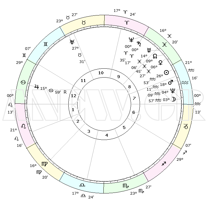 | | ΘΕΣΕΙΣ ΠΛΑΝΗΤΩΝ ΑΣΤΡΟΛΟΓΙΚΟΥ ΧΑΡΤΗ ΤΗΣ ΣΤΙΓΜΗΣ ΑΥΤΗΣ | | | | Πλανήτης | Ζώδιο | Μοίρες | Δεκαήμ. | Σε οίκο | Απόκλιση | | Ακμές των οίκων | | Ηλιος | Υδροχόος | 26°50' | Τρίτο | 9 | 12 S 34 | | 1ος | 12°34' | Καρκίνος | | Σελήνη | Υδροχόος | 03°12' | Πρώτο | 8 | 22 S 26 | | 2ος | 02°59' | Λέων | | Ερμής | Ιχθείς | 14°01' | Δεύτερο | 9 | 06 S 08 | | 3ος | 25°52' | Λέων | | Αφροδίτη | Ιχθείς | 06°23' | Πρώτο | 9 | 10 S 32 | | 4ος | 24°16' | Παρθένος | | Αρης | Υδροχόος | 18°08' | Δεύτερο | 8 | 16 S 25 | | 5ος | 29°47' | Ζυγός | | Δίας | Καρκίνος | 15°59'R | Δεύτερο | 1 | 22 N 48 | | 6ος | 08°22' | Τοξότης | | Κρόνος | Κριός | 00°17' | Πρώτο | 10 | 01 S 52 | | 7ος | 12°34' | Αιγόκερως | | Ουρανός | Ταύρος | 27°31' | Τρίτο | 11 | 19 N 25 | | 8ος | 02°59' | Υδροχόος | | Ποσειδώνας | Κριός | 00°35' | Πρώτο | 10 | 00 S 58 | | 9ος | 25°52' | Υδροχόος | | Πλούτωνας | Υδροχόος | 04°09' | Πρώτο | 8 | 22 S 56 | | 10ος | 24°16' | Ιχθείς | | Β. Δεσμός | Ιχθείς | 09°46' | Πρώτο | 9 | 07 S 54 | | 11ος | 29°47' | Κριός | | Ωροσκόπος | Καρκίνος | 12°34' | Δεύτερο | | | 12ος | 08°22' | Δίδυμοι | | Μεσουράνημα | Ιχθείς | 24°16' | Τρίτο | | | |