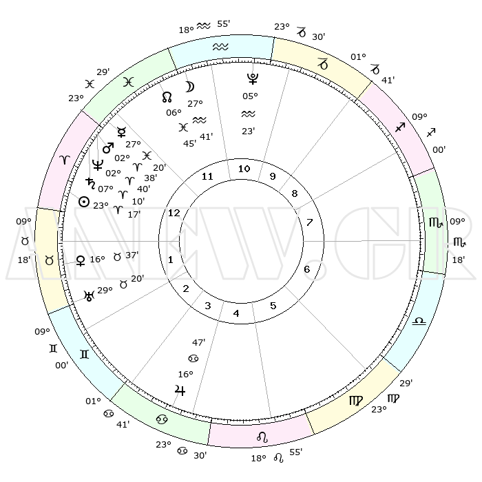 | | ΘΕΣΕΙΣ ΠΛΑΝΗΤΩΝ ΑΣΤΡΟΛΟΓΙΚΟΥ ΧΑΡΤΗ ΤΗΣ ΣΤΙΓΜΗΣ ΑΥΤΗΣ | | | | Πλανήτης | Ζώδιο | Μοίρες | Δεκαήμ. | Σε οίκο | Απόκλιση | | Ακμές των οίκων | | Ηλιος | Κριός | 23°32' | Τρίτο | 9 | 09 N 08 | | 1ος | 11°56' | Λέων | | Σελήνη | Ιχθείς | 01°07' | Πρώτο | 7 | 11 S 40 | | 2ος | 03°57' | Παρθένος | | Ερμής | Ιχθείς | 27°41' | Τρίτο | 8 | 03 S 15 | | 3ος | 00°36' | Ζυγός | | Αφροδίτη | Ταύρος | 16°57' | Δεύτερο | 10 | 16 N 59 | | 4ος | 02°49' | Σκορπιός | | Αρης | Κριός | 02°51' | Πρώτο | 9 | 00 N 13 | | 5ος | 08°18' | Τοξότης | | Δίας | Καρκίνος | 16°49' | Δεύτερο | 12 | 22 N 45 | | 6ος | 12°11' | Αιγόκερως | | Κρόνος | Κριός | 07°12' | Πρώτο | 9 | 00 N 53 | | 7ος | 11°56' | Υδροχόος | | Ουρανός | Ταύρος | 29°21' | Τρίτο | 10 | 19 N 50 | | 8ος | 03°57' | Ιχθείς | | Ποσειδώνας | Κριός | 02°40' | Πρώτο | 9 | 00 S 09 | | 9ος | 00°36' | Κριός | | Πλούτωνας | Υδροχόος | 05°23' | Πρώτο | 6 | 22 S 47 | | 10ος | 02°49' | Ταύρος | | Β. Δεσμός | Ιχθείς | 06°45' | Πρώτο | 8 | 09 S 02 | | 11ος | 08°18' | Δίδυμοι | | Ωροσκόπος | Λέων | 11°56' | Δεύτερο | | | 12ος | 12°11' | Καρκίνος | | Μεσουράνημα | Ταύρος | 02°49' | Πρώτο | | | |