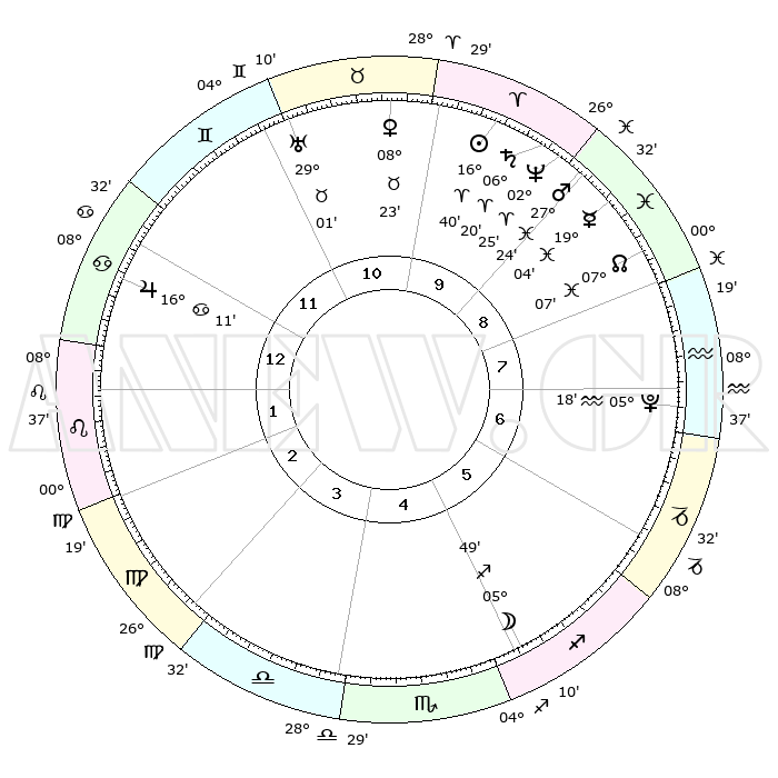 | | ΘΕΣΕΙΣ ΠΛΑΝΗΤΩΝ ΑΣΤΡΟΛΟΓΙΚΟΥ ΧΑΡΤΗ ΤΗΣ ΣΤΙΓΜΗΣ ΑΥΤΗΣ | | | | Πλανήτης | Ζώδιο | Μοίρες | Δεκαήμ. | Σε οίκο | Απόκλιση | | Ακμές των οίκων | | Ηλιος | Κριός | 16°24' | Δεύτερο | 12 | 06 N 27 | | 1ος | 24°43' | Κριός | | Σελήνη | Τοξότης | 02°29' | Πρώτο | 8 | 25 S 41 | | 2ος | 28°25' | Ταύρος | | Ερμής | Ιχθείς | 18°45' | Δεύτερο | 12 | 06 S 17 | | 3ος | 22°32' | Δίδυμοι | | Αφροδίτη | Ταύρος | 08°02' | Πρώτο | 1 | 13 N 58 | | 4ος | 14°13' | Καρκίνος | | Αρης | Ιχθείς | 27°11' | Τρίτο | 12 | 02 S 04 | | 5ος | 08°08' | Λέων | | Δίας | Καρκίνος | 16°09' | Δεύτερο | 4 | 22 N 50 | | 6ος | 09°49' | Παρθένος | | Κρόνος | Κριός | 06°18' | Πρώτο | 12 | 00 N 33 | | 7ος | 24°43' | Ζυγός | | Ουρανός | Ταύρος | 28°60' | Τρίτο | 2 | 19 N 46 | | 8ος | 28°25' | Σκορπιός | | Ποσειδώνας | Κριός | 02°24' | Πρώτο | 12 | 00 S 15 | | 9ος | 22°32' | Τοξότης | | Πλούτωνας | Υδροχόος | 05°18' | Πρώτο | 10 | 22 S 47 | | 10ος | 14°13' | Αιγόκερως | | Β. Δεσμός | Ιχθείς | 07°08' | Πρώτο | 11 | 08 S 53 | | 11ος | 08°08' | Υδροχόος | | Ωροσκόπος | Κριός | 24°43' | Τρίτο | | | 12ος | 09°49' | Ιχθείς | | Μεσουράνημα | Αιγόκερως | 14°13' | Δεύτερο | | | |