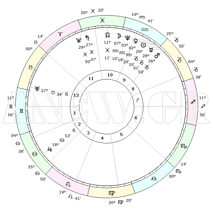 | | ΘΕΣΕΙΣ ΠΛΑΝΗΤΩΝ ΑΣΤΡΟΛΟΓΙΚΟΥ ΧΑΡΤΗ ΤΗΣ ΣΤΙΓΜΗΣ ΑΥΤΗΣ | | | | Πλανήτης | Ζώδιο | Μοίρες | Δεκαήμ. | Σε οίκο | Απόκλιση | | Ακμές των οίκων | | Ηλιος | Αιγόκερως | 29°07' | Τρίτο | 1 | 20 S 20 | | 1ος | 12°33' | Αιγόκερως | | Σελήνη | Υδροχόος | 03°20' | Πρώτο | 1 | 22 S 22 | | 2ος | 22°54' | Υδροχόος | | Ερμής | Αιγόκερως | 27°31' | Τρίτο | 1 | 22 S 36 | | 3ος | 03°08' | Κριός | | Αφροδίτη | Υδροχόος | 02°06' | Πρώτο | 1 | 20 S 45 | | 4ος | 04°50' | Ταύρος | | Αρης | Αιγόκερως | 26°45' | Τρίτο | 1 | 21 S 46 | | 5ος | 29°20' | Ταύρος | | Δίας | Καρκίνος | 18°55'R | Δεύτερο | 7 | 22 N 23 | | 6ος | 20°36' | Δίδυμοι | | Κρόνος | Ιχθείς | 27°35' | Τρίτο | 2 | 02 S 59 | | 7ος | 12°33' | Καρκίνος | | Ουρανός | Ταύρος | 27°34'R | Τρίτο | 4 | 19 N 25 | | 8ος | 22°54' | Λέων | | Ποσειδώνας | Ιχθείς | 29°49' | Τρίτο | 2 | 01 S 17 | | 9ος | 03°08' | Ζυγός | | Πλούτωνας | Υδροχόος | 03°18' | Πρώτο | 1 | 23 S 06 | | 10ος | 04°50' | Σκορπιός | | Β. Δεσμός | Ιχθείς | 11°12' | Δεύτερο | 2 | 07 S 22 | | 11ος | 29°20' | Σκορπιός | | Ωροσκόπος | Αιγόκερως | 12°33' | Δεύτερο | | | 12ος | 20°36' | Τοξότης | | Μεσουράνημα | Σκορπιός | 04°50' | Πρώτο | | | |