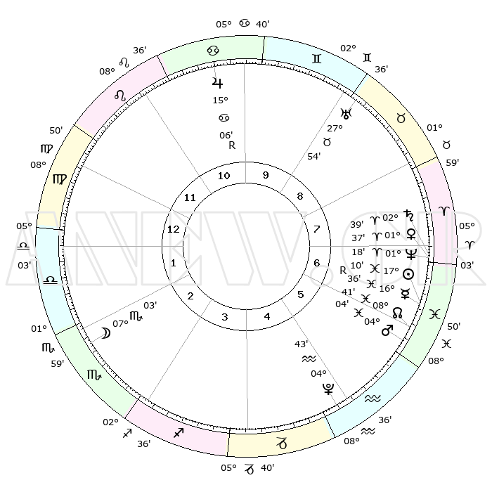 | | ΘΕΣΕΙΣ ΠΛΑΝΗΤΩΝ ΑΣΤΡΟΛΟΓΙΚΟΥ ΧΑΡΤΗ ΤΗΣ ΣΤΙΓΜΗΣ ΑΥΤΗΣ | | | | Πλανήτης | Ζώδιο | Μοίρες | Δεκαήμ. | Σε οίκο | Απόκλιση | | Ακμές των οίκων | | Ηλιος | Ιχθείς | 17°07' | Δεύτερο | 6 | 05 S 05 | | 1ος | 18°52' | Παρθένος | | Σελήνη | Σκορπιός | 06°23' | Πρώτο | 2 | 17 S 50 | | 2ος | 14°34' | Ζυγός | | Ερμής | Ιχθείς | 16°39'R | Δεύτερο | 6 | 01 S 56 | | 3ος | 14°31' | Σκορπιός | | Αφροδίτη | Κριός | 01°33' | Πρώτο | 7 | 00 S 31 | | 4ος | 17°27' | Τοξότης | | Αρης | Ιχθείς | 04°01' | Πρώτο | 6 | 11 S 03 | | 5ος | 20°40' | Αιγόκερως | | Δίας | Καρκίνος | 15°06'R | Δεύτερο | 10 | 22 N 56 | | 6ος | 21°33' | Υδροχόος | | Κρόνος | Κριός | 02°39' | Πρώτο | 7 | 00 S 54 | | 7ος | 18°52' | Ιχθείς | | Ουρανός | Ταύρος | 27°54' | Τρίτο | 9 | 19 N 31 | | 8ος | 14°34' | Κριός | | Ποσειδώνας | Κριός | 01°18' | Πρώτο | 7 | 00 S 41 | | 9ος | 14°31' | Ταύρος | | Πλούτωνας | Υδροχόος | 04°43' | Πρώτο | 5 | 22 S 51 | | 10ος | 17°27' | Δίδυμοι | | Β. Δεσμός | Ιχθείς | 08°41' | Πρώτο | 6 | 08 S 19 | | 11ος | 20°40' | Καρκίνος | | Ωροσκόπος | Παρθένος | 18°52' | Δεύτερο | | | 12ος | 21°33' | Λέων | | Μεσουράνημα | Δίδυμοι | 17°27' | Δεύτερο | | | |