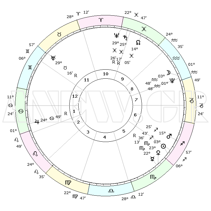 | | ΘΕΣΕΙΣ ΠΛΑΝΗΤΩΝ ΑΣΤΡΟΛΟΓΙΚΟΥ ΧΑΡΤΗ ΤΗΣ ΣΤΙΓΜΗΣ ΑΥΤΗΣ | | | | Πλανήτης | Ζώδιο | Μοίρες | Δεκαήμ. | Σε οίκο | Απόκλιση | | Ακμές των οίκων | | Ηλιος | Τοξότης | 03°37' | Πρώτο | 6 | 20 S 52 | | 1ος | 12°55' | Δίδυμοι | | Σελήνη | Υδροχόος | 02°46' | Πρώτο | 9 | 22 S 47 | | 2ος | 05°28' | Καρκίνος | | Ερμής | Σκορπιός | 22°17'R | Τρίτο | 6 | 16 S 23 | | 3ος | 26°41' | Καρκίνος | | Αφροδίτη | Σκορπιός | 23°29' | Τρίτο | 6 | 17 S 47 | | 4ος | 20°39' | Λέων | | Αρης | Τοξότης | 15°21' | Δεύτερο | 7 | 23 S 15 | | 5ος | 21°29' | Παρθένος | | Δίας | Καρκίνος | 24°50'R | Τρίτο | 2 | 21 N 18 | | 6ος | 01°28' | Σκορπιός | | Κρόνος | Ιχθείς | 25°17'R | Τρίτο | 11 | 04 S 04 | | 7ος | 12°55' | Τοξότης | | Ουρανός | Ταύρος | 29°16'R | Τρίτο | 12 | 19 N 47 | | 8ος | 05°28' | Αιγόκερως | | Ποσειδώνας | Ιχθείς | 29°26'R | Τρίτο | 11 | 01 S 28 | | 9ος | 26°41' | Αιγόκερως | | Πλούτωνας | Υδροχόος | 01°48' | Πρώτο | 9 | 23 S 26 | | 10ος | 20°39' | Υδροχόος | | Β. Δεσμός | Ιχθείς | 14°06' | Δεύτερο | 10 | 06 S 15 | | 11ος | 21°29' | Ιχθείς | | Ωροσκόπος | Δίδυμοι | 12°55' | Δεύτερο | | | 12ος | 01°28' | Ταύρος | | Μεσουράνημα | Υδροχόος | 20°39' | Τρίτο | | | |