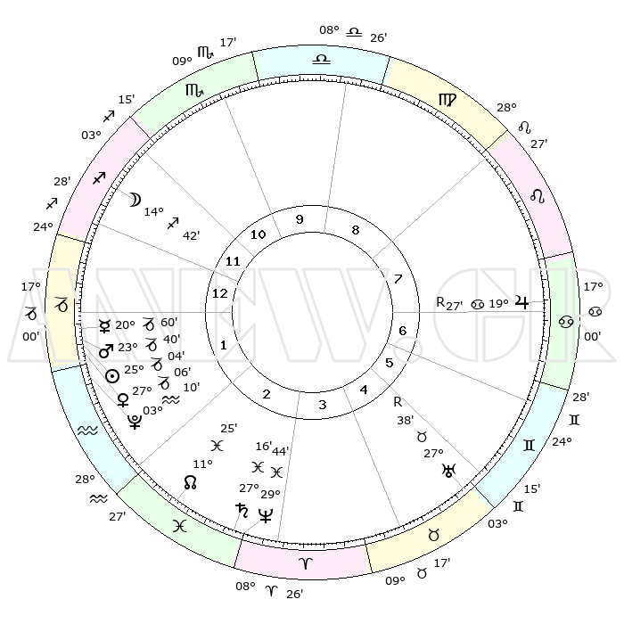 | | ΘΕΣΕΙΣ ΠΛΑΝΗΤΩΝ ΑΣΤΡΟΛΟΓΙΚΟΥ ΧΑΡΤΗ ΤΗΣ ΣΤΙΓΜΗΣ ΑΥΤΗΣ | | | | Πλανήτης | Ζώδιο | Μοίρες | Δεκαήμ. | Σε οίκο | Απόκλιση | | Ακμές των οίκων | | Ηλιος | Αιγόκερως | 25°00' | Τρίτο | 1 | 21 S 08 | | 1ος | 26°27' | Τοξότης | | Σελήνη | Τοξότης | 13°59' | Δεύτερο | 12 | 27 S 33 | | 2ος | 02°44' | Υδροχόος | | Ερμής | Αιγόκερως | 20°54' | Τρίτο | 1 | 23 S 35 | | 3ος | 12°26' | Ιχθείς | | Αφροδίτη | Αιγόκερως | 27°02' | Τρίτο | 1 | 21 S 43 | | 4ος | 16°54' | Κριός | | Αρης | Αιγόκερως | 23°37' | Τρίτο | 1 | 22 S 20 | | 5ος | 13°48' | Ταύρος | | Δίας | Καρκίνος | 19°27'R | Δεύτερο | 7 | 22 N 17 | | 6ος | 05°51' | Δίδυμοι | | Κρόνος | Ιχθείς | 27°15' | Τρίτο | 3 | 03 S 07 | | 7ος | 26°27' | Δίδυμοι | | Ουρανός | Ταύρος | 27°38'R | Τρίτο | 5 | 19 N 26 | | 8ος | 02°43' | Λέων | | Ποσειδώνας | Ιχθείς | 29°44' | Τρίτο | 3 | 01 S 19 | | 9ος | 12°26' | Παρθένος | | Πλούτωνας | Υδροχόος | 03°10' | Πρώτο | 2 | 23 S 08 | | 10ος | 16°54' | Ζυγός | | Β. Δεσμός | Ιχθείς | 11°25' | Δεύτερο | 2 | 07 S 17 | | 11ος | 13°48' | Σκορπιός | | Ωροσκόπος | Τοξότης | 26°27' | Τρίτο | | | 12ος | 05°51' | Τοξότης | | Μεσουράνημα | Ζυγός | 16°54' | Δεύτερο | | | |