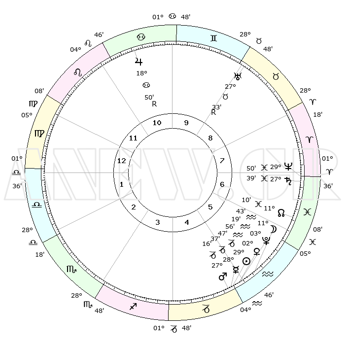 | | ΘΕΣΕΙΣ ΠΛΑΝΗΤΩΝ ΑΣΤΡΟΛΟΓΙΚΟΥ ΧΑΡΤΗ ΤΗΣ ΣΤΙΓΜΗΣ ΑΥΤΗΣ | | | | Πλανήτης | Ζώδιο | Μοίρες | Δεκαήμ. | Σε οίκο | Απόκλιση | | Ακμές των οίκων | | Ηλιος | Αιγόκερως | 29°43' | Τρίτο | 5 | 20 S 12 | | 1ος | 11°58' | Παρθένος | | Σελήνη | Υδροχόος | 10°52' | Δεύτερο | 5 | 19 S 53 | | 2ος | 07°02' | Ζυγός | | Ερμής | Αιγόκερως | 28°30' | Τρίτο | 5 | 22 S 25 | | 3ος | 06°37' | Σκορπιός | | Αφροδίτη | Υδροχόος | 02°51' | Πρώτο | 5 | 20 S 36 | | 4ος | 09°34' | Τοξότης | | Αρης | Αιγόκερως | 27°13' | Τρίτο | 5 | 21 S 41 | | 5ος | 13°03' | Αιγόκερως | | Δίας | Καρκίνος | 18°51'R | Δεύτερο | 11 | 22 N 23 | | 6ος | 14°15' | Υδροχόος | | Κρόνος | Ιχθείς | 27°38' | Τρίτο | 7 | 02 S 58 | | 7ος | 11°58' | Ιχθείς | | Ουρανός | Ταύρος | 27°33'R | Τρίτο | 9 | 19 N 25 | | 8ος | 07°02' | Κριός | | Ποσειδώνας | Ιχθείς | 29°50' | Τρίτο | 7 | 01 S 17 | | 9ος | 06°37' | Ταύρος | | Πλούτωνας | Υδροχόος | 03°19' | Πρώτο | 5 | 23 S 06 | | 10ος | 09°34' | Δίδυμοι | | Β. Δεσμός | Ιχθείς | 11°10' | Δεύτερο | 6 | 07 S 22 | | 11ος | 13°03' | Καρκίνος | | Ωροσκόπος | Παρθένος | 11°58' | Δεύτερο | | | 12ος | 14°15' | Λέων | | Μεσουράνημα | Δίδυμοι | 09°34' | Πρώτο | | | |