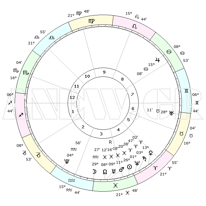 | | ΘΕΣΕΙΣ ΠΛΑΝΗΤΩΝ ΑΣΤΡΟΛΟΓΙΚΟΥ ΧΑΡΤΗ ΤΗΣ ΣΤΙΓΜΗΣ ΑΥΤΗΣ | | | | Πλανήτης | Ζώδιο | Μοίρες | Δεκαήμ. | Σε οίκο | Απόκλιση | | Ακμές των οίκων | | Ηλιος | Ιχθείς | 26°17' | Τρίτο | 4 | 01 S 29 | | 1ος | 20°54' | Σκορπιός | | Σελήνη | Υδροχόος | 28°44' | Τρίτο | 3 | 12 S 47 | | 2ος | 20°56' | Τοξότης | | Ερμής | Ιχθείς | 09°17'R | Πρώτο | 4 | 06 S 16 | | 3ος | 25°13' | Αιγόκερως | | Αφροδίτη | Κριός | 12°58' | Δεύτερο | 5 | 04 N 12 | | 4ος | 00°52' | Ιχθείς | | Αρης | Ιχθείς | 11°15' | Δεύτερο | 4 | 08 S 21 | | 5ος | 02°52' | Κριός | | Δίας | Καρκίνος | 15°08' | Δεύτερο | 8 | 22 N 56 | | 6ος | 29°09' | Κριός | | Κρόνος | Κριός | 03°47' | Πρώτο | 5 | 00 S 27 | | 7ος | 20°54' | Ταύρος | | Ουρανός | Ταύρος | 28°10' | Τρίτο | 7 | 19 N 35 | | 8ος | 20°56' | Δίδυμοι | | Ποσειδώνας | Κριός | 01°38' | Πρώτο | 4 | 00 S 33 | | 9ος | 25°13' | Καρκίνος | | Πλούτωνας | Υδροχόος | 04°56' | Πρώτο | 3 | 22 S 49 | | 10ος | 00°52' | Παρθένος | | Β. Δεσμός | Ιχθείς | 08°12' | Πρώτο | 4 | 08 S 29 | | 11ος | 02°52' | Ζυγός | | Ωροσκόπος | Σκορπιός | 20°54' | Τρίτο | | | 12ος | 29°09' | Ζυγός | | Μεσουράνημα | Παρθένος | 00°52' | Πρώτο | | | |