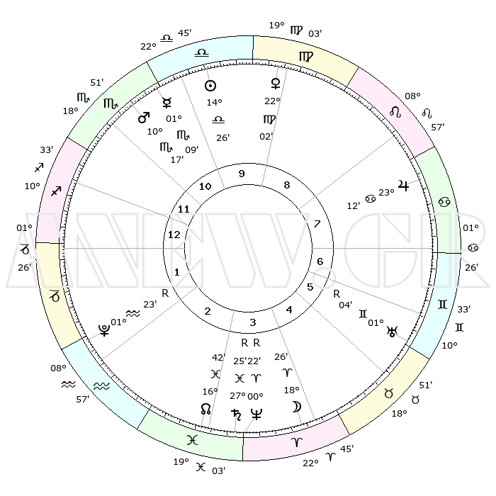 | ΘΕΣΕΙΣ ΠΛΑΝΗΤΩΝ ΑΣΤΡΟΛΟΓΙΚΟΥ ΧΑΡΤΗ ΤΗΣ ΣΤΙΓΜΗΣ ΑΥΤΗΣ | | Πλανήτης | Ζώδιο | Μοίρες | Δεκαήμ. | Σε οίκο | Απόκλιση | | Ακμές των οίκων | Ηλιος | Ζυγός | 14°21' | Δεύτερο | 10 | 05 S 39 | | 1ος | 06°07' | Τοξότης | Σελήνη | Κριός | 17°13' | Δεύτερο | 4 | 09 N 06 | | 2ος | 08°10' | Αιγόκερως | Ερμής | Σκορπιός | 01°01' | Πρώτο | 11 | 12 S 38 | | 3ος | 14°54' | Υδροχόος | Αφροδίτη | Παρθένος | 21°56' | Τρίτο | 10 | 04 N 30 | | 4ος | 20°59' | Ιχθείς | Αρης | Σκορπιός | 10°14' | Δεύτερο | 11 | 15 S 01 | | 5ος | 21°11' | Κριός | Δίας | Καρκίνος | 23°12' | Τρίτο | 8 | 21 N 28 | | 6ος | 15°25' | Ταύρος | Κρόνος | Ιχθείς | 27°25'R | Τρίτο | 4 | 03 S 20 | | 7ος | 06°07' | Δίδυμοι | Ουρανός | Δίδυμοι | 01°04'R | Πρώτο | 6 | 20 N 10 | | 8ος | 08°10' | Καρκίνος | Ποσειδώνας | Κριός | 00°22'R | Πρώτο | 4 | 01 S 07 | | 9ος | 14°54' | Λέων | Πλούτωνας | Υδροχόος | 01°23'R | Πρώτο | 2 | 23 S 32 | | 10ος | 20°59' | Παρθένος | Β. Δεσμός | Ιχθείς | 16°42' | Δεύτερο | 3 | 05 S 15 | | 11ος | 21°11' | Ζυγός | Ωροσκόπος | Τοξότης | 06°07' | Πρώτο | | | 12ος | 15°25' | Σκορπιός | Μεσουράνημα | Παρθένος | 20°59' | Τρίτο | | | |