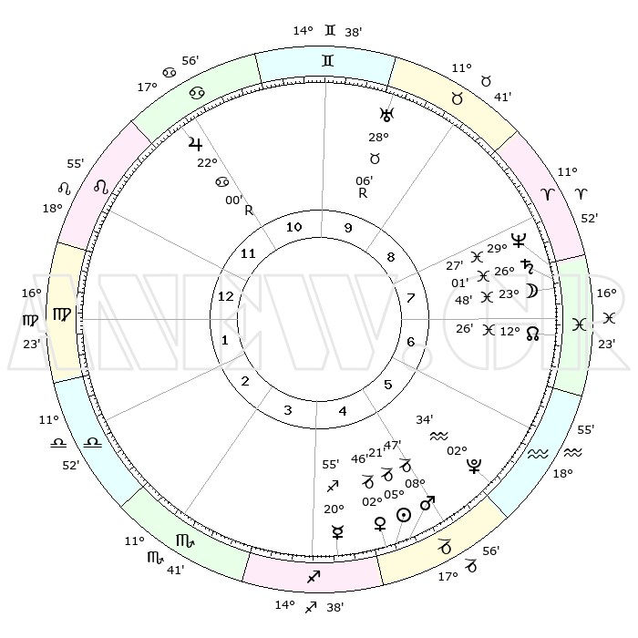 | | ΘΕΣΕΙΣ ΠΛΑΝΗΤΩΝ ΑΣΤΡΟΛΟΓΙΚΟΥ ΧΑΡΤΗ ΤΗΣ ΣΤΙΓΜΗΣ ΑΥΤΗΣ | | | | Πλανήτης | Ζώδιο | Μοίρες | Δεκαήμ. | Σε οίκο | Απόκλιση | | Ακμές των οίκων | | Ηλιος | Αιγόκερως | 05°15' | Πρώτο | 5 | 23 S 20 | | 1ος | 21°27' | Λέων | | Σελήνη | Ιχθείς | 22°40' | Τρίτο | 8 | 01 S 59 | | 2ος | 14°25' | Παρθένος | | Ερμής | Τοξότης | 20°48' | Τρίτο | 5 | 23 S 05 | | 3ος | 12°13' | Ζυγός | | Αφροδίτη | Αιγόκερως | 02°40' | Πρώτο | 5 | 23 S 43 | | 4ος | 14°57' | Σκορπιός | | Αρης | Αιγόκερως | 08°43' | Πρώτο | 5 | 24 S 00 | | 5ος | 19°45' | Τοξότης | | Δίας | Καρκίνος | 22°01'R | Τρίτο | 11 | 21 N 51 | | 6ος | 22°29' | Αιγόκερως | | Κρόνος | Ιχθείς | 26°00' | Τρίτο | 8 | 03 S 41 | | 7ος | 21°27' | Υδροχόος | | Ουρανός | Ταύρος | 28°06'R | Τρίτο | 10 | 19 N 32 | | 8ος | 14°25' | Ιχθείς | | Ποσειδώνας | Ιχθείς | 29°27' | Τρίτο | 8 | 01 S 27 | | 9ος | 12°13' | Κριός | | Πλούτωνας | Υδροχόος | 02°34' | Πρώτο | 6 | 23 S 15 | | 10ος | 14°57' | Ταύρος | | Β. Δεσμός | Ιχθείς | 12°27' | Δεύτερο | 7 | 06 S 53 | | 11ος | 19°45' | Δίδυμοι | | Ωροσκόπος | Λέων | 21°27' | Τρίτο | | | 12ος | 22°29' | Καρκίνος | | Μεσουράνημα | Ταύρος | 14°57' | Δεύτερο | | | |