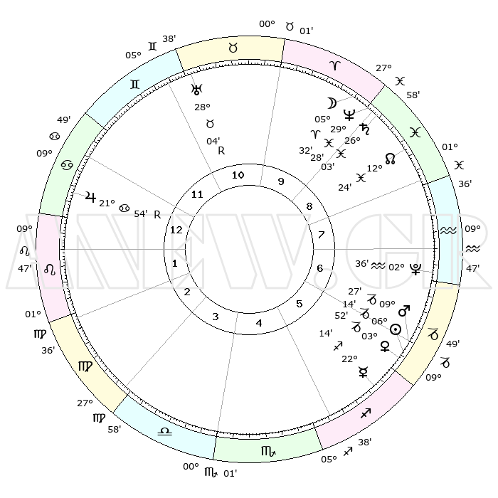 | | ΘΕΣΕΙΣ ΠΛΑΝΗΤΩΝ ΑΣΤΡΟΛΟΓΙΚΟΥ ΧΑΡΤΗ ΤΗΣ ΣΤΙΓΜΗΣ ΑΥΤΗΣ | | | | Πλανήτης | Ζώδιο | Μοίρες | Δεκαήμ. | Σε οίκο | Απόκλιση | | Ακμές των οίκων | | Ηλιος | Αιγόκερως | 06°10' | Πρώτο | 6 | 23 S 17 | | 1ος | 20°52' | Καρκίνος | | Σελήνη | Κριός | 04°39' | Πρώτο | 9 | 03 N 42 | | 2ος | 11°26' | Λέων | | Ερμής | Τοξότης | 22°08' | Τρίτο | 6 | 23 S 16 | | 3ος | 05°17' | Παρθένος | | Αφροδίτη | Αιγόκερως | 03°47' | Πρώτο | 6 | 23 S 43 | | 4ος | 05°02' | Ζυγός | | Αρης | Αιγόκερως | 09°24' | Πρώτο | 6 | 23 S 58 | | 5ος | 11°03' | Σκορπιός | | Δίας | Καρκίνος | 21°54'R | Τρίτο | 1 | 21 N 53 | | 6ος | 18°18' | Τοξότης | | Κρόνος | Ιχθείς | 26°03' | Τρίτο | 9 | 03 S 39 | | 7ος | 20°52' | Αιγόκερως | | Ουρανός | Ταύρος | 28°04'R | Τρίτο | 11 | 19 N 32 | | 8ος | 11°26' | Υδροχόος | | Ποσειδώνας | Ιχθείς | 29°28' | Τρίτο | 9 | 01 S 26 | | 9ος | 05°17' | Ιχθείς | | Πλούτωνας | Υδροχόος | 02°36' | Πρώτο | 7 | 23 S 15 | | 10ος | 05°02' | Κριός | | Β. Δεσμός | Ιχθείς | 12°24' | Δεύτερο | 9 | 06 S 54 | | 11ος | 11°03' | Ταύρος | | Ωροσκόπος | Καρκίνος | 20°52' | Τρίτο | | | 12ος | 18°18' | Δίδυμοι | | Μεσουράνημα | Κριός | 05°02' | Πρώτο | | | |