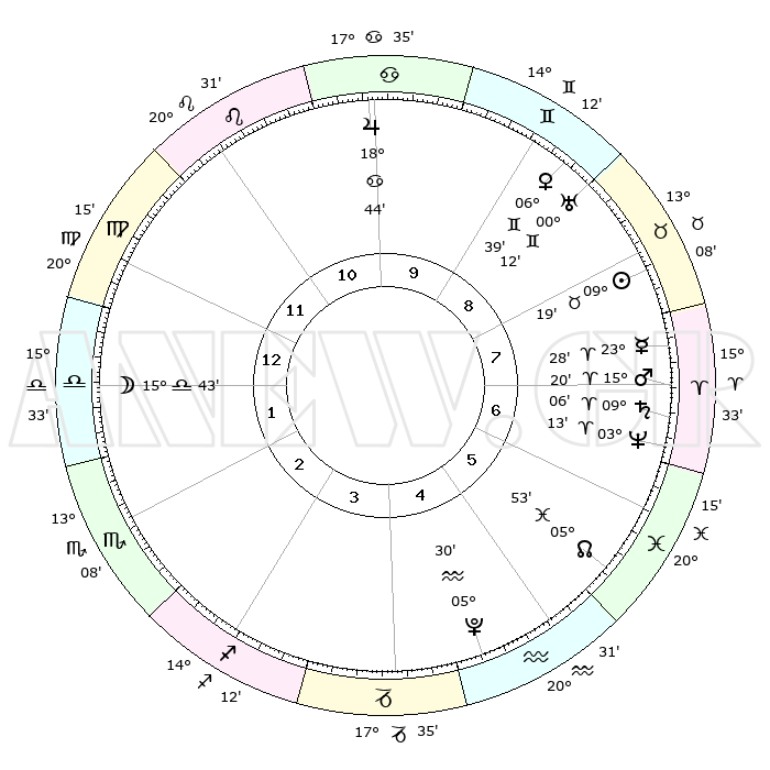 | | ΘΕΣΕΙΣ ΠΛΑΝΗΤΩΝ ΑΣΤΡΟΛΟΓΙΚΟΥ ΧΑΡΤΗ ΤΗΣ ΣΤΙΓΜΗΣ ΑΥΤΗΣ | | | | Πλανήτης | Ζώδιο | Μοίρες | Δεκαήμ. | Σε οίκο | Απόκλιση | | Ακμές των οίκων | | Ηλιος | Ταύρος | 09°16' | Πρώτο | 8 | 14 N 35 | | 1ος | 27°45' | Παρθένος | | Σελήνη | Ζυγός | 14°58' | Δεύτερο | 1 | 08 S 45 | | 2ος | 24°10' | Ζυγός | | Ερμής | Κριός | 23°21' | Τρίτο | 7 | 07 N 09 | | 3ος | 24°31' | Σκορπιός | | Αφροδίτη | Δίδυμοι | 06°34' | Πρώτο | 9 | 22 N 13 | | 4ος | 27°28' | Τοξότης | | Αρης | Κριός | 15°17' | Δεύτερο | 7 | 05 N 12 | | 5ος | 00°29' | Υδροχόος | | Δίας | Καρκίνος | 18°43' | Δεύτερο | 10 | 22 N 31 | | 6ος | 00°60' | Ιχθείς | | Κρόνος | Κριός | 09°06' | Πρώτο | 7 | 01 N 37 | | 7ος | 27°45' | Ιχθείς | | Ουρανός | Δίδυμοι | 00°12' | Πρώτο | 9 | 20 N 02 | | 8ος | 24°10' | Κριός | | Ποσειδώνας | Κριός | 03°13' | Πρώτο | 7 | 00 N 04 | | 9ος | 24°31' | Ταύρος | | Πλούτωνας | Υδροχόος | 05°30' | Πρώτο | 5 | 22 S 49 | | 10ος | 27°28' | Δίδυμοι | | Β. Δεσμός | Ιχθείς | 05°53' | Πρώτο | 6 | 09 S 21 | | 11ος | 00°29' | Λέων | | Ωροσκόπος | Παρθένος | 27°45' | Τρίτο | | | 12ος | 00°60' | Παρθένος | | Μεσουράνημα | Δίδυμοι | 27°28' | Τρίτο | | | |