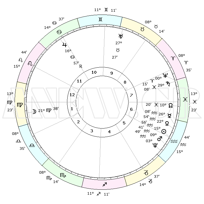 | | ΘΕΣΕΙΣ ΠΛΑΝΗΤΩΝ ΑΣΤΡΟΛΟΓΙΚΟΥ ΧΑΡΤΗ ΤΗΣ ΣΤΙΓΜΗΣ ΑΥΤΗΣ | | | | Πλανήτης | Ζώδιο | Μοίρες | Δεκαήμ. | Σε οίκο | Απόκλιση | | Ακμές των οίκων | | Ηλιος | Υδροχόος | 15°51' | Δεύτερο | 6 | 16 S 05 | | 1ος | 20°55' | Λέων | | Σελήνη | Παρθένος | 20°38' | Τρίτο | 2 | 02 N 45 | | 2ος | 13°49' | Παρθένος | | Ερμής | Υδροχόος | 25°60' | Τρίτο | 7 | 14 S 21 | | 3ος | 11°33' | Ζυγός | | Αφροδίτη | Υδροχόος | 22°48' | Τρίτο | 7 | 15 S 15 | | 4ος | 14°16' | Σκορπιός | | Αρης | Υδροχόος | 09°37' | Πρώτο | 6 | 18 S 51 | | 5ος | 19°06' | Τοξότης | | Δίας | Καρκίνος | 16°58'R | Δεύτερο | 11 | 22 N 40 | | 6ος | 21°54' | Αιγόκερως | | Κρόνος | Ιχθείς | 29°08' | Τρίτο | 8 | 02 S 20 | | 7ος | 20°55' | Υδροχόος | | Ουρανός | Ταύρος | 27°27' | Τρίτο | 10 | 19 N 24 | | 8ος | 13°49' | Ιχθείς | | Ποσειδώνας | Κριός | 00°15' | Πρώτο | 8 | 01 S 06 | | 9ος | 11°33' | Κριός | | Πλούτωνας | Υδροχόος | 03°49' | Πρώτο | 6 | 23 S 00 | | 10ος | 14°16' | Ταύρος | | Β. Δεσμός | Ιχθείς | 10°20' | Δεύτερο | 7 | 07 S 41 | | 11ος | 19°06' | Δίδυμοι | | Ωροσκόπος | Λέων | 20°55' | Τρίτο | | | 12ος | 21°54' | Καρκίνος | | Μεσουράνημα | Ταύρος | 14°16' | Δεύτερο | | | |