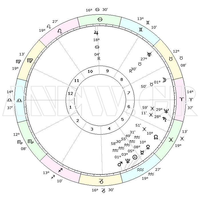 | | ΘΕΣΕΙΣ ΠΛΑΝΗΤΩΝ ΑΣΤΡΟΛΟΓΙΚΟΥ ΧΑΡΤΗ ΤΗΣ ΣΤΙΓΜΗΣ ΑΥΤΗΣ | | | | Πλανήτης | Ζώδιο | Μοίρες | Δεκαήμ. | Σε οίκο | Απόκλιση | | Ακμές των οίκων | | Ηλιος | Υδροχόος | 05°51' | Πρώτο | 5 | 18 S 48 | | 1ος | 23°07' | Παρθένος | | Σελήνη | Ταύρος | 00°49' | Πρώτο | 8 | 15 N 34 | | 2ος | 19°11' | Ζυγός | | Ερμής | Υδροχόος | 08°41' | Πρώτο | 5 | 20 S 06 | | 3ος | 19°20' | Σκορπιός | | Αφροδίτη | Υδροχόος | 10°25' | Δεύτερο | 5 | 18 S 50 | | 4ος | 22°16' | Τοξότης | | Αρης | Υδροχόος | 01°54' | Πρώτο | 5 | 20 S 44 | | 5ος | 25°22' | Αιγόκερως | | Δίας | Καρκίνος | 18°05'R | Δεύτερο | 10 | 22 N 30 | | 6ος | 26°04' | Υδροχόος | | Κρόνος | Ιχθείς | 28°10' | Τρίτο | 7 | 02 S 44 | | 7ος | 23°07' | Ιχθείς | | Ουρανός | Ταύρος | 27°30'R | Τρίτο | 9 | 19 N 25 | | 8ος | 19°11' | Κριός | | Ποσειδώνας | Ιχθείς | 29°59' | Τρίτο | 7 | 01 S 13 | | 9ος | 19°20' | Ταύρος | | Πλούτωνας | Υδροχόος | 03°30' | Πρώτο | 5 | 23 S 04 | | 10ος | 22°16' | Δίδυμοι | | Β. Δεσμός | Ιχθείς | 10°51' | Δεύτερο | 6 | 07 S 30 | | 11ος | 25°22' | Καρκίνος | | Ωροσκόπος | Παρθένος | 23°07' | Τρίτο | | | 12ος | 26°04' | Λέων | | Μεσουράνημα | Δίδυμοι | 22°16' | Τρίτο | | | |