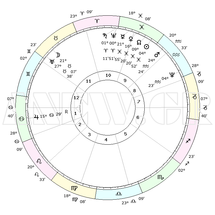 | | ΘΕΣΕΙΣ ΠΛΑΝΗΤΩΝ ΑΣΤΡΟΛΟΓΙΚΟΥ ΧΑΡΤΗ ΤΗΣ ΣΤΙΓΜΗΣ ΑΥΤΗΣ | | | | Πλανήτης | Ζώδιο | Μοίρες | Δεκαήμ. | Σε οίκο | Απόκλιση | | Ακμές των οίκων | | Ηλιος | Ιχθείς | 04°47' | Πρώτο | 10 | 09 S 45 | | 1ος | 12°53' | Δίδυμοι | | Σελήνη | Ταύρος | 20°06' | Τρίτο | 12 | 22 N 35 | | 2ος | 05°27' | Καρκίνος | | Ερμής | Ιχθείς | 21°53' | Τρίτο | 11 | 01 S 16 | | 3ος | 26°39' | Καρκίνος | | Αφροδίτη | Ιχθείς | 16°15' | Δεύτερο | 10 | 06 S 44 | | 4ος | 20°37' | Λέων | | Αρης | Υδροχόος | 24°21' | Τρίτο | 10 | 14 S 26 | | 5ος | 21°27' | Παρθένος | | Δίας | Καρκίνος | 15°29'R | Δεύτερο | 2 | 22 N 52 | | 6ος | 01°25' | Σκορπιός | | Κρόνος | Κριός | 01°11' | Πρώτο | 11 | 01 S 30 | | 7ος | 12°53' | Τοξότης | | Ουρανός | Ταύρος | 27°37' | Τρίτο | 12 | 19 N 27 | | 8ος | 05°27' | Αιγόκερως | | Ποσειδώνας | Κριός | 00°51' | Πρώτο | 11 | 00 S 52 | | 9ος | 26°39' | Αιγόκερως | | Πλούτωνας | Υδροχόος | 04°23' | Πρώτο | 9 | 22 S 54 | | 10ος | 20°37' | Υδροχόος | | Β. Δεσμός | Ιχθείς | 09°20' | Πρώτο | 10 | 08 S 04 | | 11ος | 21°27' | Ιχθείς | | Ωροσκόπος | Δίδυμοι | 12°53' | Δεύτερο | | | 12ος | 01°25' | Ταύρος | | Μεσουράνημα | Υδροχόος | 20°37' | Τρίτο | | | |