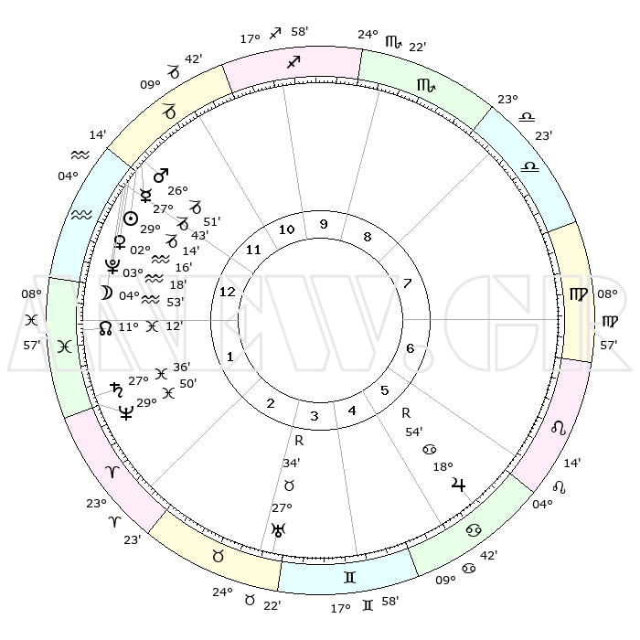 | | ΘΕΣΕΙΣ ΠΛΑΝΗΤΩΝ ΑΣΤΡΟΛΟΓΙΚΟΥ ΧΑΡΤΗ ΤΗΣ ΣΤΙΓΜΗΣ ΑΥΤΗΣ | | | | Πλανήτης | Ζώδιο | Μοίρες | Δεκαήμ. | Σε οίκο | Απόκλιση | | Ακμές των οίκων | | Ηλιος | Αιγόκερως | 29°10' | Τρίτο | 12 | 20 S 19 | | 1ος | 01°49' | Υδροχόος | | Σελήνη | Υδροχόος | 03°57' | Πρώτο | 1 | 22 S 11 | | 2ος | 16°12' | Ιχθείς | | Ερμής | Αιγόκερως | 27°36' | Τρίτο | 12 | 22 S 35 | | 3ος | 24°21' | Κριός | | Αφροδίτη | Υδροχόος | 02°10' | Πρώτο | 1 | 20 S 44 | | 4ος | 22°31' | Ταύρος | | Αρης | Αιγόκερως | 26°47' | Τρίτο | 12 | 21 S 46 | | 5ος | 15°09' | Δίδυμοι | | Δίας | Καρκίνος | 18°55'R | Δεύτερο | 6 | 22 N 23 | | 6ος | 06°38' | Καρκίνος | | Κρόνος | Ιχθείς | 27°35' | Τρίτο | 2 | 02 S 59 | | 7ος | 01°49' | Λέων | | Ουρανός | Ταύρος | 27°34'R | Τρίτο | 4 | 19 N 25 | | 8ος | 16°12' | Παρθένος | | Ποσειδώνας | Ιχθείς | 29°49' | Τρίτο | 2 | 01 S 17 | | 9ος | 24°21' | Ζυγός | | Πλούτωνας | Υδροχόος | 03°18' | Πρώτο | 1 | 23 S 06 | | 10ος | 22°31' | Σκορπιός | | Β. Δεσμός | Ιχθείς | 11°12' | Δεύτερο | 1 | 07 S 22 | | 11ος | 15°09' | Τοξότης | | Ωροσκόπος | Υδροχόος | 01°49' | Πρώτο | | | 12ος | 06°38' | Αιγόκερως | | Μεσουράνημα | Σκορπιός | 22°31' | Τρίτο | | | |