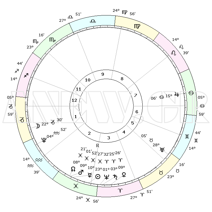 | | ΘΕΣΕΙΣ ΠΛΑΝΗΤΩΝ ΑΣΤΡΟΛΟΓΙΚΟΥ ΧΑΡΤΗ ΤΗΣ ΣΤΙΓΜΗΣ ΑΥΤΗΣ | | | | Πλανήτης | Ζώδιο | Μοίρες | Δεκαήμ. | Σε οίκο | Απόκλιση | | Ακμές των οίκων | | Ηλιος | Ιχθείς | 23°23' | Τρίτο | 3 | 02 S 38 | | 1ος | 15°46' | Τοξότης | | Σελήνη | Αιγόκερως | 21°44' | Τρίτο | 2 | 25 S 30 | | 2ος | 19°37' | Αιγόκερως | | Ερμής | Ιχθείς | 10°55'R | Δεύτερο | 3 | 05 S 01 | | 3ος | 27°56' | Υδροχόος | | Αφροδίτη | Κριός | 09°21' | Πρώτο | 4 | 02 N 43 | | 4ος | 03°36' | Κριός | | Αρης | Ιχθείς | 08°58' | Πρώτο | 3 | 09 S 13 | | 5ος | 02°17' | Ταύρος | | Δίας | Καρκίνος | 15°06' | Δεύτερο | 7 | 22 N 56 | | 6ος | 25°21' | Ταύρος | | Κρόνος | Κριός | 03°25' | Πρώτο | 3 | 00 S 36 | | 7ος | 15°46' | Δίδυμοι | | Ουρανός | Ταύρος | 28°05' | Τρίτο | 6 | 19 N 33 | | 8ος | 19°37' | Καρκίνος | | Ποσειδώνας | Κριός | 01°32' | Πρώτο | 3 | 00 S 35 | | 9ος | 27°56' | Λέων | | Πλούτωνας | Υδροχόος | 04°52' | Πρώτο | 2 | 22 S 50 | | 10ος | 03°36' | Ζυγός | | Β. Δεσμός | Ιχθείς | 08°21' | Πρώτο | 3 | 08 S 26 | | 11ος | 02°17' | Σκορπιός | | Ωροσκόπος | Τοξότης | 15°46' | Δεύτερο | | | 12ος | 25°21' | Σκορπιός | | Μεσουράνημα | Ζυγός | 03°36' | Πρώτο | | | |