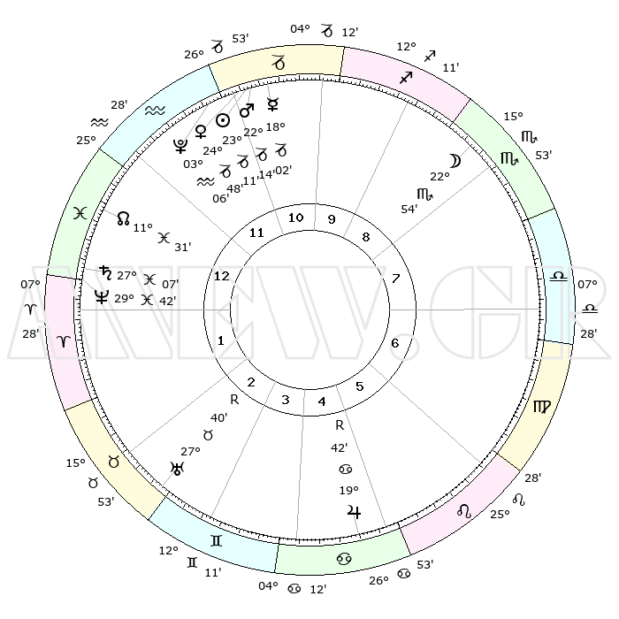 | | ΘΕΣΕΙΣ ΠΛΑΝΗΤΩΝ ΑΣΤΡΟΛΟΓΙΚΟΥ ΧΑΡΤΗ ΤΗΣ ΣΤΙΓΜΗΣ ΑΥΤΗΣ | | | | Πλανήτης | Ζώδιο | Μοίρες | Δεκαήμ. | Σε οίκο | Απόκλιση | | Ακμές των οίκων | | Ηλιος | Αιγόκερως | 23°07' | Τρίτο | 11 | 21 S 27 | | 1ος | 25°51' | Υδροχόος | | Σελήνη | Σκορπιός | 22°03' | Τρίτο | 9 | 22 S 59 | | 2ος | 11°32' | Κριός | | Ερμής | Αιγόκερως | 17°55' | Δεύτερο | 11 | 23 S 54 | | 3ος | 15°04' | Ταύρος | | Αφροδίτη | Αιγόκερως | 24°42' | Τρίτο | 11 | 22 S 06 | | 4ος | 09°54' | Δίδυμοι | | Αρης | Αιγόκερως | 22°11' | Τρίτο | 11 | 22 S 33 | | 5ος | 01°37' | Καρκίνος | | Δίας | Καρκίνος | 19°42'R | Δεύτερο | 5 | 22 N 15 | | 6ος | 24°46' | Καρκίνος | | Κρόνος | Ιχθείς | 27°07' | Τρίτο | 1 | 03 S 11 | | 7ος | 25°51' | Λέων | | Ουρανός | Ταύρος | 27°40'R | Τρίτο | 3 | 19 N 27 | | 8ος | 11°32' | Ζυγός | | Ποσειδώνας | Ιχθείς | 29°42' | Τρίτο | 1 | 01 S 20 | | 9ος | 15°04' | Σκορπιός | | Πλούτωνας | Υδροχόος | 03°06' | Πρώτο | 12 | 23 S 08 | | 10ος | 09°54' | Τοξότης | | Β. Δεσμός | Ιχθείς | 11°31' | Δεύτερο | 1 | 07 S 15 | | 11ος | 01°37' | Αιγόκερως | | Ωροσκόπος | Υδροχόος | 25°51' | Τρίτο | | | 12ος | 24°46' | Αιγόκερως | | Μεσουράνημα | Τοξότης | 09°54' | Πρώτο | | | |