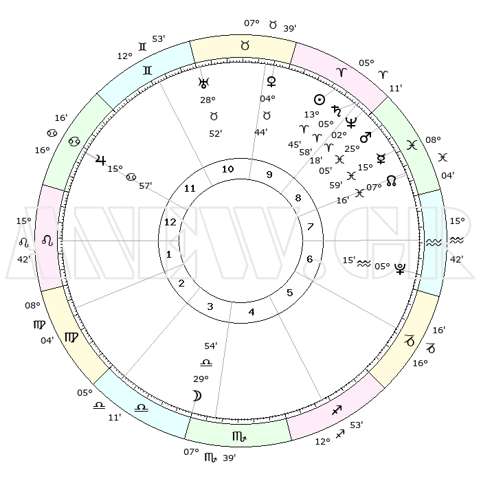 | | ΘΕΣΕΙΣ ΠΛΑΝΗΤΩΝ ΑΣΤΡΟΛΟΓΙΚΟΥ ΧΑΡΤΗ ΤΗΣ ΣΤΙΓΜΗΣ ΑΥΤΗΣ | | | | Πλανήτης | Ζώδιο | Μοίρες | Δεκαήμ. | Σε οίκο | Απόκλιση | | Ακμές των οίκων | | Ηλιος | Κριός | 13°41' | Δεύτερο | 10 | 05 N 24 | | 1ος | 25°29' | Καρκίνος | | Σελήνη | Ζυγός | 29°03' | Τρίτο | 4 | 14 S 52 | | 2ος | 16°15' | Λέων | | Ερμής | Ιχθείς | 15°54' | Δεύτερο | 9 | 07 S 05 | | 3ος | 10°41' | Παρθένος | | Αφροδίτη | Ταύρος | 04°38' | Πρώτο | 10 | 12 N 45 | | 4ος | 11°07' | Ζυγός | | Αρης | Ιχθείς | 25°02' | Τρίτο | 9 | 02 S 56 | | 5ος | 17°13' | Σκορπιός | | Δίας | Καρκίνος | 15°57' | Δεύτερο | 12 | 22 N 51 | | 6ος | 23°41' | Τοξότης | | Κρόνος | Κριός | 05°58' | Πρώτο | 9 | 00 N 25 | | 7ος | 25°29' | Αιγόκερως | | Ουρανός | Ταύρος | 28°52' | Τρίτο | 11 | 19 N 44 | | 8ος | 16°15' | Υδροχόος | | Ποσειδώνας | Κριός | 02°18' | Πρώτο | 9 | 00 S 17 | | 9ος | 10°41' | Ιχθείς | | Πλούτωνας | Υδροχόος | 05°15' | Πρώτο | 7 | 22 S 47 | | 10ος | 11°07' | Κριός | | Β. Δεσμός | Ιχθείς | 07°16' | Πρώτο | 8 | 08 S 50 | | 11ος | 17°13' | Ταύρος | | Ωροσκόπος | Καρκίνος | 25°29' | Τρίτο | | | 12ος | 23°41' | Δίδυμοι | | Μεσουράνημα | Κριός | 11°07' | Δεύτερο | | | |