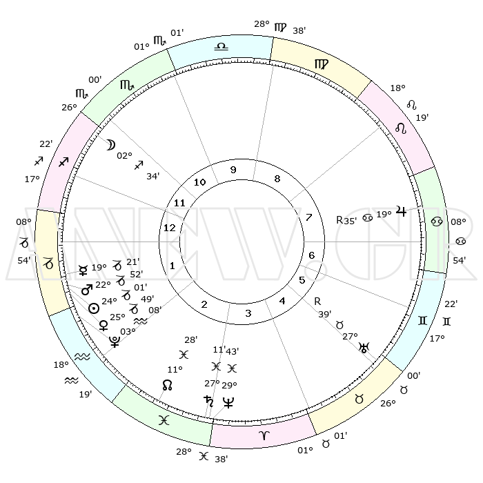 | | ΘΕΣΕΙΣ ΠΛΑΝΗΤΩΝ ΑΣΤΡΟΛΟΓΙΚΟΥ ΧΑΡΤΗ ΤΗΣ ΣΤΙΓΜΗΣ ΑΥΤΗΣ | | | | Πλανήτης | Ζώδιο | Μοίρες | Δεκαήμ. | Σε οίκο | Απόκλιση | | Ακμές των οίκων | | Ηλιος | Αιγόκερως | 23°56' | Τρίτο | 2 | 21 S 19 | | 1ος | 13°27' | Τοξότης | | Σελήνη | Τοξότης | 01°38' | Πρώτο | 12 | 25 S 27 | | 2ος | 16°49' | Αιγόκερως | | Ερμής | Αιγόκερως | 19°13' | Δεύτερο | 2 | 23 S 46 | | 3ος | 24°47' | Υδροχόος | | Αφροδίτη | Αιγόκερως | 25°43' | Τρίτο | 2 | 21 S 56 | | 4ος | 00°36' | Κριός | | Αρης | Αιγόκερως | 22°48' | Τρίτο | 2 | 22 S 27 | | 5ος | 29°40' | Κριός | | Δίας | Καρκίνος | 19°36'R | Δεύτερο | 8 | 22 N 16 | | 6ος | 22°60' | Ταύρος | | Κρόνος | Ιχθείς | 27°11' | Τρίτο | 3 | 03 S 10 | | 7ος | 13°27' | Δίδυμοι | | Ουρανός | Ταύρος | 27°39'R | Τρίτο | 6 | 19 N 26 | | 8ος | 16°49' | Καρκίνος | | Ποσειδώνας | Ιχθείς | 29°43' | Τρίτο | 3 | 01 S 20 | | 9ος | 24°47' | Λέων | | Πλούτωνας | Υδροχόος | 03°08' | Πρώτο | 2 | 23 S 08 | | 10ος | 00°36' | Ζυγός | | Β. Δεσμός | Ιχθείς | 11°28' | Δεύτερο | 3 | 07 S 16 | | 11ος | 29°40' | Ζυγός | | Ωροσκόπος | Τοξότης | 13°27' | Δεύτερο | | | 12ος | 22°60' | Σκορπιός | | Μεσουράνημα | Ζυγός | 00°36' | Πρώτο | | | |