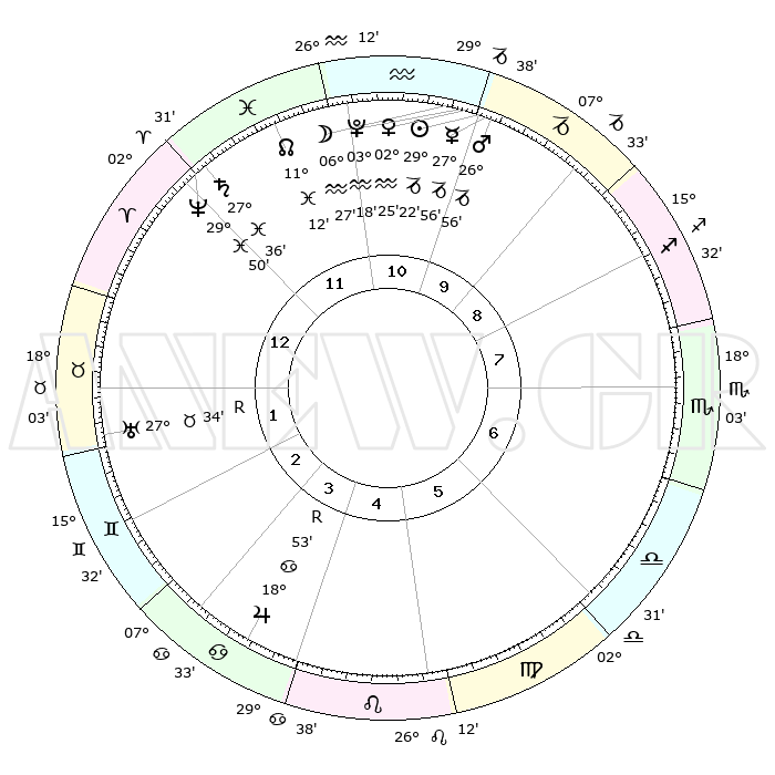 | | ΘΕΣΕΙΣ ΠΛΑΝΗΤΩΝ ΑΣΤΡΟΛΟΓΙΚΟΥ ΧΑΡΤΗ ΤΗΣ ΣΤΙΓΜΗΣ ΑΥΤΗΣ | | | | Πλανήτης | Ζώδιο | Μοίρες | Δεκαήμ. | Σε οίκο | Απόκλιση | | Ακμές των οίκων | | Ηλιος | Αιγόκερως | 29°18' | Τρίτο | 10 | 20 S 18 | | 1ος | 13°47' | Κριός | | Σελήνη | Υδροχόος | 05°38' | Πρώτο | 11 | 21 S 39 | | 2ος | 20°30' | Ταύρος | | Ερμής | Αιγόκερως | 27°49' | Τρίτο | 10 | 22 S 33 | | 3ος | 15°57' | Δίδυμοι | | Αφροδίτη | Υδροχόος | 02°20' | Πρώτο | 11 | 20 S 42 | | 4ος | 07°48' | Καρκίνος | | Αρης | Αιγόκερως | 26°53' | Τρίτο | 10 | 21 S 45 | | 5ος | 00°52' | Λέων | | Δίας | Καρκίνος | 18°54'R | Δεύτερο | 4 | 22 N 23 | | 6ος | 00°32' | Παρθένος | | Κρόνος | Ιχθείς | 27°36' | Τρίτο | 12 | 02 S 59 | | 7ος | 13°47' | Ζυγός | | Ουρανός | Ταύρος | 27°34'R | Τρίτο | 2 | 19 N 25 | | 8ος | 20°30' | Σκορπιός | | Ποσειδώνας | Ιχθείς | 29°50' | Τρίτο | 12 | 01 S 17 | | 9ος | 15°57' | Τοξότης | | Πλούτωνας | Υδροχόος | 03°18' | Πρώτο | 11 | 23 S 06 | | 10ος | 07°48' | Αιγόκερως | | Β. Δεσμός | Ιχθείς | 11°12' | Δεύτερο | 12 | 07 S 22 | | 11ος | 00°52' | Υδροχόος | | Ωροσκόπος | Κριός | 13°47' | Δεύτερο | | | 12ος | 00°32' | Ιχθείς | | Μεσουράνημα | Αιγόκερως | 07°48' | Πρώτο | | | |