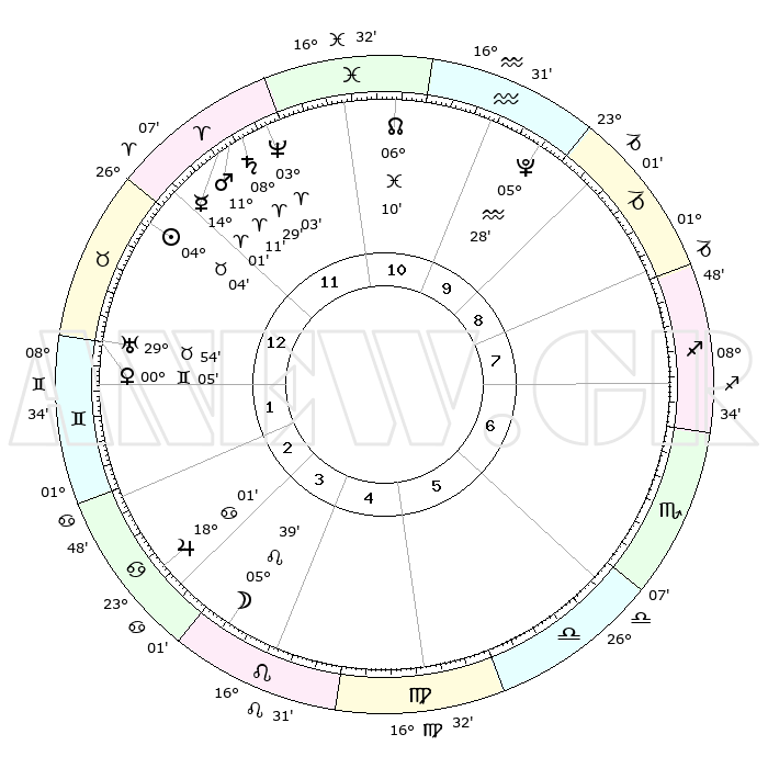 | | ΘΕΣΕΙΣ ΠΛΑΝΗΤΩΝ ΑΣΤΡΟΛΟΓΙΚΟΥ ΧΑΡΤΗ ΤΗΣ ΣΤΙΓΜΗΣ ΑΥΤΗΣ | | | | Πλανήτης | Ζώδιο | Μοίρες | Δεκαήμ. | Σε οίκο | Απόκλιση | | Ακμές των οίκων | | Ηλιος | Ταύρος | 04°01' | Πρώτο | 12 | 12 N 51 | | 1ος | 17°53' | Ταύρος | | Σελήνη | Λέων | 04°60' | Πρώτο | 4 | 21 N 40 | | 2ος | 15°24' | Δίδυμοι | | Ερμής | Κριός | 13°56' | Δεύτερο | 12 | 03 N 13 | | 3ος | 07°27' | Καρκίνος | | Αφροδίτη | Δίδυμοι | 00°02' | Πρώτο | 1 | 20 N 44 | | 4ος | 29°31' | Καρκίνος | | Αρης | Κριός | 11°09' | Δεύτερο | 12 | 03 N 33 | | 5ος | 26°04' | Λέων | | Δίας | Καρκίνος | 18°01' | Δεύτερο | 3 | 22 N 36 | | 6ος | 02°21' | Ζυγός | | Κρόνος | Κριός | 08°29' | Πρώτο | 12 | 01 N 23 | | 7ος | 17°53' | Σκορπιός | | Ουρανός | Ταύρος | 29°54' | Τρίτο | 1 | 19 N 58 | | 8ος | 15°24' | Τοξότης | | Ποσειδώνας | Κριός | 03°03' | Πρώτο | 12 | 00 N 00 | | 9ος | 07°27' | Αιγόκερως | | Πλούτωνας | Υδροχόος | 05°28' | Πρώτο | 10 | 22 S 48 | | 10ος | 29°31' | Αιγόκερως | | Β. Δεσμός | Ιχθείς | 06°11' | Πρώτο | 11 | 09 S 15 | | 11ος | 26°04' | Υδροχόος | | Ωροσκόπος | Ταύρος | 17°53' | Δεύτερο | | | 12ος | 02°21' | Κριός | | Μεσουράνημα | Αιγόκερως | 29°31' | Τρίτο | | | |