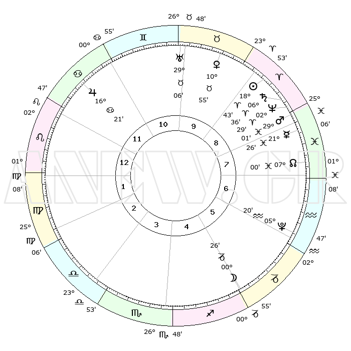 | | ΘΕΣΕΙΣ ΠΛΑΝΗΤΩΝ ΑΣΤΡΟΛΟΓΙΚΟΥ ΧΑΡΤΗ ΤΗΣ ΣΤΙΓΜΗΣ ΑΥΤΗΣ | | | | Πλανήτης | Ζώδιο | Μοίρες | Δεκαήμ. | Σε οίκο | Απόκλιση | | Ακμές των οίκων | | Ηλιος | Κριός | 18°40' | Δεύτερο | 9 | 07 N 19 | | 1ος | 16°02' | Λέων | | Σελήνη | Τοξότης | 29°49' | Τρίτο | 5 | 28 S 14 | | 2ος | 08°26' | Παρθένος | | Ερμής | Ιχθείς | 21°22' | Τρίτο | 8 | 05 S 27 | | 3ος | 05°36' | Ζυγός | | Αφροδίτη | Ταύρος | 10°51' | Δεύτερο | 10 | 14 N 58 | | 4ος | 08°05' | Σκορπιός | | Αρης | Ιχθείς | 28°58' | Τρίτο | 8 | 01 S 20 | | 5ος | 13°17' | Τοξότης | | Δίας | Καρκίνος | 16°21' | Δεύτερο | 11 | 22 N 48 | | 6ος | 16°38' | Αιγόκερως | | Κρόνος | Κριός | 06°35' | Πρώτο | 9 | 00 N 39 | | 7ος | 16°02' | Υδροχόος | | Ουρανός | Ταύρος | 29°06' | Τρίτο | 10 | 19 N 47 | | 8ος | 08°26' | Ιχθείς | | Ποσειδώνας | Κριός | 02°29' | Πρώτο | 8 | 00 S 13 | | 9ος | 05°36' | Κριός | | Πλούτωνας | Υδροχόος | 05°20' | Πρώτο | 6 | 22 S 47 | | 10ος | 08°05' | Ταύρος | | Β. Δεσμός | Ιχθείς | 07°00' | Πρώτο | 7 | 08 S 56 | | 11ος | 13°17' | Δίδυμοι | | Ωροσκόπος | Λέων | 16°02' | Δεύτερο | | | 12ος | 16°38' | Καρκίνος | | Μεσουράνημα | Ταύρος | 08°05' | Πρώτο | | | |