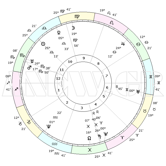 | ΘΕΣΕΙΣ ΠΛΑΝΗΤΩΝ ΑΣΤΡΟΛΟΓΙΚΟΥ ΧΑΡΤΗ ΤΗΣ ΣΤΙΓΜΗΣ ΑΥΤΗΣ | | Πλανήτης | Ζώδιο | Μοίρες | Δεκαήμ. | Σε οίκο | Απόκλιση | | Ακμές των οίκων | Ηλιος | Ζυγός | 24°51' | Τρίτο | 3 | 09 S 37 | | 1ος | 23°01' | Λέων | Σελήνη | Παρθένος | 15°25' | Δεύτερο | 1 | 05 N 58 | | 2ος | 16°09' | Παρθένος | Ερμής | Σκορπιός | 16°09' | Δεύτερο | 3 | 18 S 37 | | 3ος | 14°07' | Ζυγός | Αφροδίτη | Ζυγός | 05°06' | Πρώτο | 2 | 00 S 37 | | 4ος | 16°54' | Σκορπιός | Αρης | Σκορπιός | 17°35' | Δεύτερο | 4 | 17 S 19 | | 5ος | 21°35' | Τοξότης | Δίας | Καρκίνος | 24°10' | Τρίτο | 12 | 21 N 20 | | 6ος | 24°10' | Αιγόκερως | Κρόνος | Ιχθείς | 26°42'R | Τρίτο | 8 | 03 S 36 | | 7ος | 23°01' | Υδροχόος | Ουρανός | Δίδυμοι | 00°46'R | Πρώτο | 10 | 20 N 06 | | 8ος | 16°09' | Ιχθείς | Ποσειδώνας | Κριός | 00°06'R | Πρώτο | 8 | 01 S 13 | | 9ος | 14°07' | Κριός | Πλούτωνας | Υδροχόος | 01°22' | Πρώτο | 6 | 23 S 32 | | 10ος | 16°54' | Ταύρος | Β. Δεσμός | Ιχθείς | 16°09' | Δεύτερο | 7 | 05 S 28 | | 11ος | 21°35' | Δίδυμοι | Ωροσκόπος | Λέων | 23°01' | Τρίτο | | | 12ος | 24°10' | Καρκίνος | Μεσουράνημα | Ταύρος | 16°54' | Δεύτερο | | | |