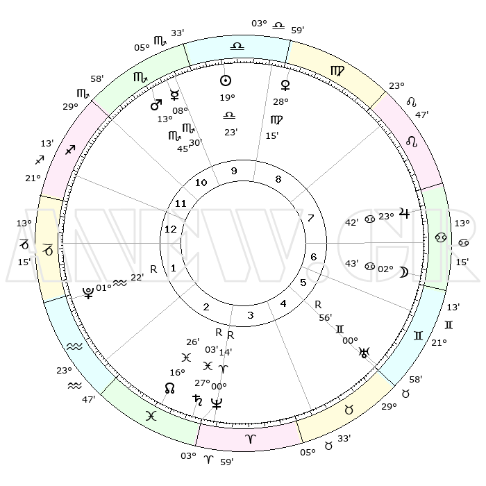 | ΘΕΣΕΙΣ ΠΛΑΝΗΤΩΝ ΑΣΤΡΟΛΟΓΙΚΟΥ ΧΑΡΤΗ ΤΗΣ ΣΤΙΓΜΗΣ ΑΥΤΗΣ | | Πλανήτης | Ζώδιο | Μοίρες | Δεκαήμ. | Σε οίκο | Απόκλιση | | Ακμές των οίκων | Ηλιος | Ζυγός | 19°17' | Δεύτερο | 10 | 07 S 33 | | 1ος | 11°51' | Τοξότης | Σελήνη | Καρκίνος | 01°21' | Πρώτο | 7 | 28 N 30 | | 2ος | 14°55' | Αιγόκερως | Ερμής | Σκορπιός | 08°21' | Πρώτο | 11 | 15 S 39 | | 3ος | 22°37' | Υδροχόος | Αφροδίτη | Παρθένος | 28°08' | Τρίτο | 9 | 02 N 06 | | 4ος | 28°32' | Ιχθείς | Αρης | Σκορπιός | 13°41' | Δεύτερο | 11 | 16 S 08 | | 5ος | 27°51' | Κριός | Δίας | Καρκίνος | 23°42' | Τρίτο | 8 | 21 N 24 | | 6ος | 21°22' | Ταύρος | Κρόνος | Ιχθείς | 27°04'R | Τρίτο | 3 | 03 S 28 | | 7ος | 11°51' | Δίδυμοι | Ουρανός | Δίδυμοι | 00°56'R | Πρώτο | 6 | 20 N 08 | | 8ος | 14°55' | Καρκίνος | Ποσειδώνας | Κριός | 00°15'R | Πρώτο | 4 | 01 S 10 | | 9ος | 22°37' | Λέων | Πλούτωνας | Υδροχόος | 01°22'R | Πρώτο | 2 | 23 S 32 | | 10ος | 28°32' | Παρθένος | Β. Δεσμός | Ιχθείς | 16°26' | Δεύτερο | 3 | 05 S 21 | | 11ος | 27°51' | Ζυγός | Ωροσκόπος | Τοξότης | 11°51' | Δεύτερο | | | 12ος | 21°22' | Σκορπιός | Μεσουράνημα | Παρθένος | 28°32' | Τρίτο | | | |