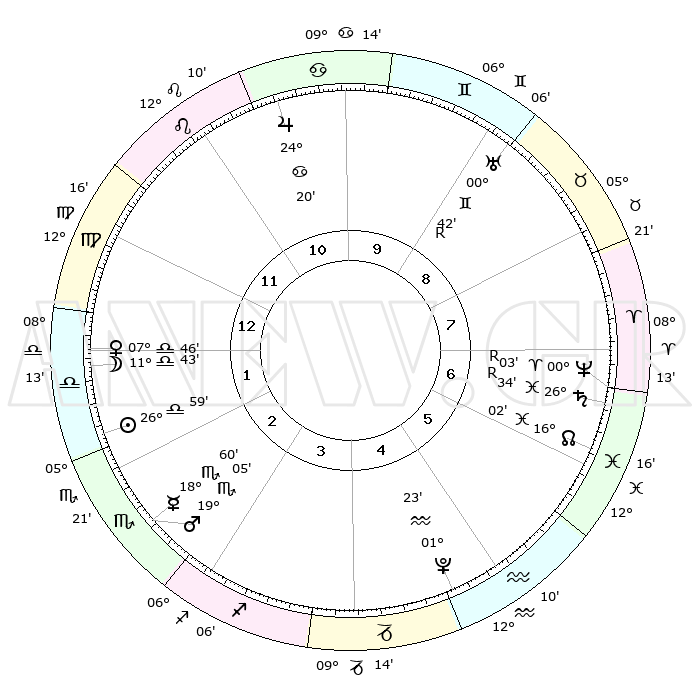 | ΘΕΣΕΙΣ ΠΛΑΝΗΤΩΝ ΑΣΤΡΟΛΟΓΙΚΟΥ ΧΑΡΤΗ ΤΗΣ ΣΤΙΓΜΗΣ ΑΥΤΗΣ | | Πλανήτης | Ζώδιο | Μοίρες | Δεκαήμ. | Σε οίκο | Απόκλιση | | Ακμές των οίκων | Ηλιος | Ζυγός | 26°51' | Τρίτο | 3 | 10 S 21 | | 1ος | 29°03' | Λέων | Σελήνη | Ζυγός | 10°06' | Δεύτερο | 2 | 05 S 48 | | 2ος | 22°48' | Παρθένος | Ερμής | Σκορπιός | 18°49' | Δεύτερο | 3 | 19 S 33 | | 3ος | 21°23' | Ζυγός | Αφροδίτη | Ζυγός | 07°36' | Πρώτο | 2 | 01 S 36 | | 4ος | 24°17' | Σκορπιός | Αρης | Σκορπιός | 18°60' | Δεύτερο | 3 | 17 S 44 | | 5ος | 28°33' | Τοξότης | Δίας | Καρκίνος | 24°19' | Τρίτο | 11 | 21 N 18 | | 6ος | 00°34' | Υδροχόος | Κρόνος | Ιχθείς | 26°34'R | Τρίτο | 8 | 03 S 39 | | 7ος | 29°03' | Υδροχόος | Ουρανός | Δίδυμοι | 00°42'R | Πρώτο | 10 | 20 N 05 | | 8ος | 22°48' | Ιχθείς | Ποσειδώνας | Κριός | 00°03'R | Πρώτο | 8 | 01 S 14 | | 9ος | 21°23' | Κριός | Πλούτωνας | Υδροχόος | 01°22' | Πρώτο | 6 | 23 S 32 | | 10ος | 24°17' | Ταύρος | Β. Δεσμός | Ιχθείς | 16°02' | Δεύτερο | 7 | 05 S 30 | | 11ος | 28°33' | Δίδυμοι | Ωροσκόπος | Λέων | 29°03' | Τρίτο | | | 12ος | 00°34' | Λέων | Μεσουράνημα | Ταύρος | 24°17' | Τρίτο | | | |
