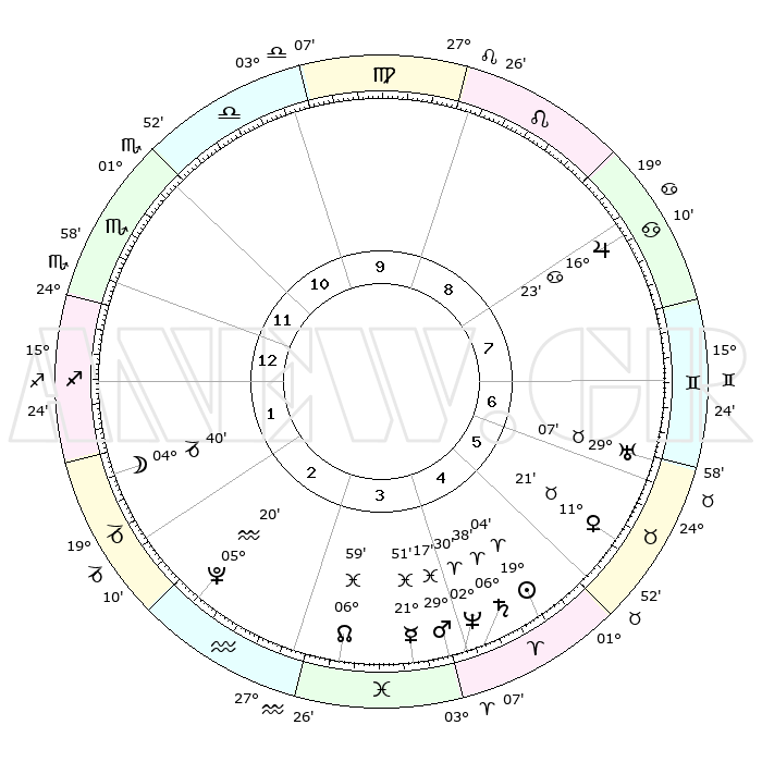 | | ΘΕΣΕΙΣ ΠΛΑΝΗΤΩΝ ΑΣΤΡΟΛΟΓΙΚΟΥ ΧΑΡΤΗ ΤΗΣ ΣΤΙΓΜΗΣ ΑΥΤΗΣ | | | | Πλανήτης | Ζώδιο | Μοίρες | Δεκαήμ. | Σε οίκο | Απόκλιση | | Ακμές των οίκων | | Ηλιος | Κριός | 18°60' | Δεύτερο | 5 | 07 N 26 | | 1ος | 25°01' | Σκορπιός | | Σελήνη | Αιγόκερως | 03°51' | Πρώτο | 2 | 28 S 02 | | 2ος | 25°30' | Τοξότης | | Ερμής | Ιχθείς | 21°46' | Τρίτο | 4 | 05 S 19 | | 3ος | 00°24' | Υδροχόος | | Αφροδίτη | Ταύρος | 11°16' | Δεύτερο | 6 | 15 N 06 | | 4ος | 06°17' | Ιχθείς | | Αρης | Ιχθείς | 29°14' | Τρίτο | 4 | 01 S 14 | | 5ος | 07°53' | Κριός | | Δίας | Καρκίνος | 16°23' | Δεύτερο | 8 | 22 N 48 | | 6ος | 03°37' | Ταύρος | | Κρόνος | Κριός | 06°38' | Πρώτο | 4 | 00 N 40 | | 7ος | 25°01' | Ταύρος | | Ουρανός | Ταύρος | 29°07' | Τρίτο | 7 | 19 N 47 | | 8ος | 25°30' | Δίδυμοι | | Ποσειδώνας | Κριός | 02°30' | Πρώτο | 4 | 00 S 12 | | 9ος | 00°24' | Λέων | | Πλούτωνας | Υδροχόος | 05°20' | Πρώτο | 3 | 22 S 47 | | 10ος | 06°17' | Παρθένος | | Β. Δεσμός | Ιχθείς | 06°59' | Πρώτο | 4 | 08 S 57 | | 11ος | 07°53' | Ζυγός | | Ωροσκόπος | Σκορπιός | 25°01' | Τρίτο | | | 12ος | 03°37' | Σκορπιός | | Μεσουράνημα | Παρθένος | 06°17' | Πρώτο | | | |