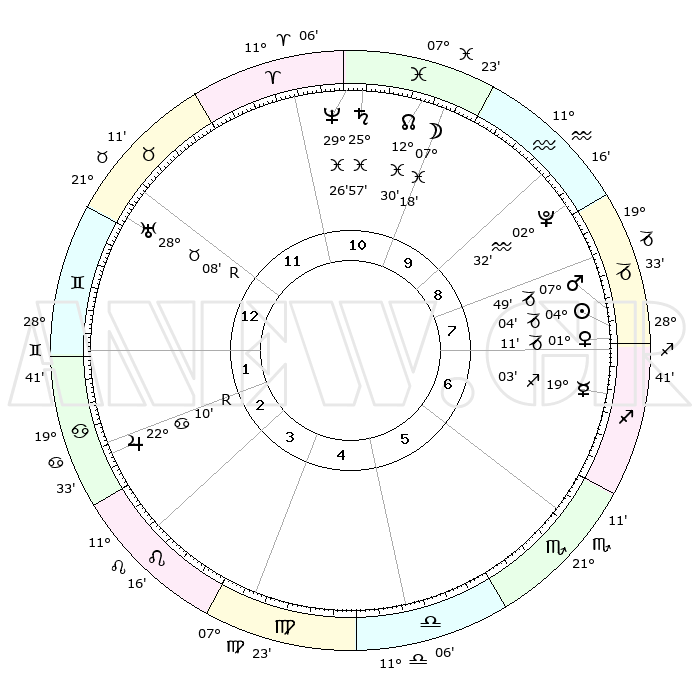 | | ΘΕΣΕΙΣ ΠΛΑΝΗΤΩΝ ΑΣΤΡΟΛΟΓΙΚΟΥ ΧΑΡΤΗ ΤΗΣ ΣΤΙΓΜΗΣ ΑΥΤΗΣ | | | | Πλανήτης | Ζώδιο | Μοίρες | Δεκαήμ. | Σε οίκο | Απόκλιση | | Ακμές των οίκων | | Ηλιος | Αιγόκερως | 03°59' | Πρώτο | 8 | 23 S 22 | | 1ος | 00°06' | Δίδυμοι | | Σελήνη | Ιχθείς | 06°18' | Πρώτο | 10 | 09 S 36 | | 2ος | 24°53' | Δίδυμοι | | Ερμής | Τοξότης | 18°56' | Δεύτερο | 7 | 22 S 47 | | 3ος | 16°18' | Καρκίνος | | Αφροδίτη | Αιγόκερως | 01°05' | Πρώτο | 8 | 23 S 41 | | 4ος | 09°04' | Λέων | | Αρης | Αιγόκερως | 07°46' | Πρώτο | 8 | 24 S 03 | | 5ος | 07°33' | Παρθένος | | Δίας | Καρκίνος | 22°10'R | Τρίτο | 3 | 21 N 50 | | 6ος | 16°01' | Ζυγός | | Κρόνος | Ιχθείς | 25°57' | Τρίτο | 11 | 03 S 42 | | 7ος | 00°06' | Τοξότης | | Ουρανός | Ταύρος | 28°08'R | Τρίτο | 12 | 19 N 33 | | 8ος | 24°53' | Τοξότης | | Ποσειδώνας | Ιχθείς | 29°26' | Τρίτο | 11 | 01 S 27 | | 9ος | 16°18' | Αιγόκερως | | Πλούτωνας | Υδροχόος | 02°32' | Πρώτο | 9 | 23 S 16 | | 10ος | 09°04' | Υδροχόος | | Β. Δεσμός | Ιχθείς | 12°31' | Δεύτερο | 11 | 06 S 52 | | 11ος | 07°33' | Ιχθείς | | Ωροσκόπος | Δίδυμοι | 00°06' | Πρώτο | | | 12ος | 16°01' | Κριός | | Μεσουράνημα | Υδροχόος | 09°04' | Πρώτο | | | |