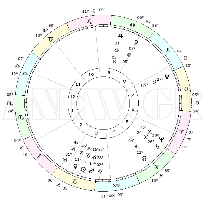 | | ΘΕΣΕΙΣ ΠΛΑΝΗΤΩΝ ΑΣΤΡΟΛΟΓΙΚΟΥ ΧΑΡΤΗ ΤΗΣ ΣΤΙΓΜΗΣ ΑΥΤΗΣ | | | | Πλανήτης | Ζώδιο | Μοίρες | Δεκαήμ. | Σε οίκο | Απόκλιση | | Ακμές των οίκων | | Ηλιος | Αιγόκερως | 12°34' | Δεύτερο | 3 | 22 S 50 | | 1ος | 15°45' | Ζυγός | | Σελήνη | Καρκίνος | 06°05' | Πρώτο | 9 | 27 N 52 | | 2ος | 13°20' | Σκορπιός | | Ερμής | Αιγόκερως | 01°39' | Πρώτο | 3 | 24 S 12 | | 3ος | 14°25' | Τοξότης | | Αφροδίτη | Αιγόκερως | 11°41' | Δεύτερο | 3 | 23 S 30 | | 4ος | 17°49' | Αιγόκερως | | Αρης | Αιγόκερως | 14°12' | Δεύτερο | 3 | 23 S 34 | | 5ος | 20°45' | Υδροχόος | | Δίας | Καρκίνος | 21°06'R | Τρίτο | 10 | 22 N 01 | | 6ος | 20°28' | Ιχθείς | | Κρόνος | Ιχθείς | 26°24' | Τρίτο | 6 | 03 S 30 | | 7ος | 15°45' | Κριός | | Ουρανός | Ταύρος | 27°54'R | Τρίτο | 8 | 19 N 30 | | 8ος | 13°20' | Ταύρος | | Ποσειδώνας | Ιχθείς | 29°32' | Τρίτο | 6 | 01 S 24 | | 9ος | 14°25' | Δίδυμοι | | Πλούτωνας | Υδροχόος | 02°47' | Πρώτο | 4 | 23 S 12 | | 10ος | 17°49' | Καρκίνος | | Β. Δεσμός | Ιχθείς | 12°04' | Δεύτερο | 5 | 07 S 02 | | 11ος | 20°45' | Λέων | | Ωροσκόπος | Ζυγός | 15°45' | Δεύτερο | | | 12ος | 20°28' | Παρθένος | | Μεσουράνημα | Καρκίνος | 17°49' | Δεύτερο | | | |