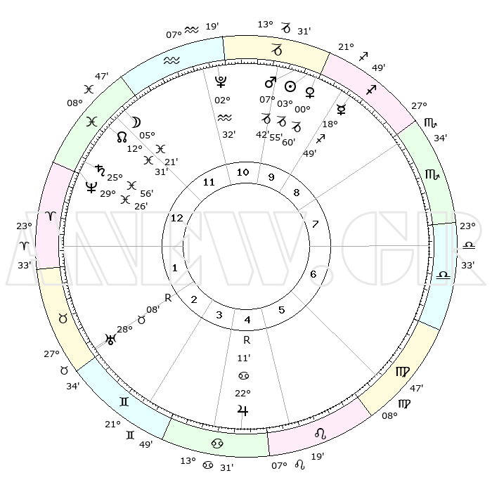 | | ΘΕΣΕΙΣ ΠΛΑΝΗΤΩΝ ΑΣΤΡΟΛΟΓΙΚΟΥ ΧΑΡΤΗ ΤΗΣ ΣΤΙΓΜΗΣ ΑΥΤΗΣ | | | | Πλανήτης | Ζώδιο | Μοίρες | Δεκαήμ. | Σε οίκο | Απόκλιση | | Ακμές των οίκων | | Ηλιος | Αιγόκερως | 03°50' | Πρώτο | 10 | 23 S 23 | | 1ος | 11°59' | Ιχθείς | | Σελήνη | Ιχθείς | 04°25' | Πρώτο | 12 | 10 S 27 | | 2ος | 25°58' | Κριός | | Ερμής | Τοξότης | 18°43' | Δεύτερο | 9 | 22 S 45 | | 3ος | 26°24' | Ταύρος | | Αφροδίτη | Αιγόκερως | 00°54' | Πρώτο | 10 | 23 S 41 | | 4ος | 19°45' | Δίδυμοι | | Αρης | Αιγόκερως | 07°39' | Πρώτο | 10 | 24 S 04 | | 5ος | 11°31' | Καρκίνος | | Δίας | Καρκίνος | 22°11'R | Τρίτο | 5 | 21 N 50 | | 6ος | 06°26' | Λέων | | Κρόνος | Ιχθείς | 25°56' | Τρίτο | 1 | 03 S 43 | | 7ος | 11°59' | Παρθένος | | Ουρανός | Ταύρος | 28°08'R | Τρίτο | 3 | 19 N 33 | | 8ος | 25°58' | Ζυγός | | Ποσειδώνας | Ιχθείς | 29°26' | Τρίτο | 1 | 01 S 27 | | 9ος | 26°24' | Σκορπιός | | Πλούτωνας | Υδροχόος | 02°32' | Πρώτο | 11 | 23 S 16 | | 10ος | 19°45' | Τοξότης | | Β. Δεσμός | Ιχθείς | 12°31' | Δεύτερο | 1 | 06 S 52 | | 11ος | 11°31' | Αιγόκερως | | Ωροσκόπος | Ιχθείς | 11°59' | Δεύτερο | | | 12ος | 06°26' | Υδροχόος | | Μεσουράνημα | Τοξότης | 19°45' | Δεύτερο | | | |