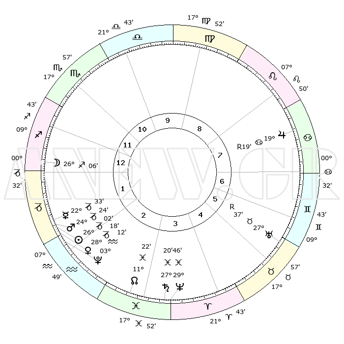 | | ΘΕΣΕΙΣ ΠΛΑΝΗΤΩΝ ΑΣΤΡΟΛΟΓΙΚΟΥ ΧΑΡΤΗ ΤΗΣ ΣΤΙΓΜΗΣ ΑΥΤΗΣ | | | | Πλανήτης | Ζώδιο | Μοίρες | Δεκαήμ. | Σε οίκο | Απόκλιση | | Ακμές των οίκων | | Ηλιος | Αιγόκερως | 25°53' | Τρίτο | 3 | 20 S 58 | | 1ος | 16°41' | Σκορπιός | | Σελήνη | Τοξότης | 24°21' | Τρίτο | 2 | 28 S 16 | | 2ος | 16°19' | Τοξότης | | Ερμής | Αιγόκερως | 22°18' | Τρίτο | 3 | 23 S 24 | | 3ος | 20°01' | Αιγόκερως | | Αφροδίτη | Αιγόκερως | 28°07' | Τρίτο | 3 | 21 S 31 | | 4ος | 25°25' | Υδροχόος | | Αρης | Αιγόκερως | 24°17' | Τρίτο | 3 | 22 S 13 | | 5ος | 27°43' | Ιχθείς | | Δίας | Καρκίνος | 19°20'R | Δεύτερο | 8 | 22 N 19 | | 6ος | 24°33' | Κριός | | Κρόνος | Ιχθείς | 27°20' | Τρίτο | 4 | 03 S 06 | | 7ος | 16°41' | Ταύρος | | Ουρανός | Ταύρος | 27°37'R | Τρίτο | 7 | 19 N 26 | | 8ος | 16°19' | Δίδυμοι | | Ποσειδώνας | Ιχθείς | 29°45' | Τρίτο | 5 | 01 S 19 | | 9ος | 20°01' | Καρκίνος | | Πλούτωνας | Υδροχόος | 03°11' | Πρώτο | 3 | 23 S 07 | | 10ος | 25°25' | Λέων | | Β. Δεσμός | Ιχθείς | 11°22' | Δεύτερο | 4 | 07 S 18 | | 11ος | 27°43' | Παρθένος | | Ωροσκόπος | Σκορπιός | 16°41' | Δεύτερο | | | 12ος | 24°33' | Ζυγός | | Μεσουράνημα | Λέων | 25°25' | Τρίτο | | | |