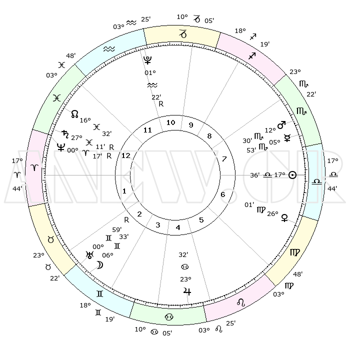 | ΘΕΣΕΙΣ ΠΛΑΝΗΤΩΝ ΑΣΤΡΟΛΟΓΙΚΟΥ ΧΑΡΤΗ ΤΗΣ ΣΤΙΓΜΗΣ ΑΥΤΗΣ | | Πλανήτης | Ζώδιο | Μοίρες | Δεκαήμ. | Σε οίκο | Απόκλιση | | Ακμές των οίκων | Ηλιος | Ζυγός | 17°24' | Δεύτερο | 9 | 06 S 50 | | 1ος | 09°46' | Αιγόκερως | Σελήνη | Δίδυμοι | 03°38' | Πρώτο | 5 | 25 N 50 | | 2ος | 19°25' | Υδροχόος | Ερμής | Σκορπιός | 05°36' | Πρώτο | 10 | 14 S 32 | | 3ος | 29°43' | Ιχθείς | Αφροδίτη | Παρθένος | 25°46' | Τρίτο | 8 | 03 N 02 | | 4ος | 01°56' | Ταύρος | Αρης | Σκορπιός | 12°22' | Δεύτερο | 10 | 15 S 43 | | 5ος | 26°49' | Ταύρος | Δίας | Καρκίνος | 23°31' | Τρίτο | 7 | 21 N 26 | | 6ος | 18°09' | Δίδυμοι | Κρόνος | Ιχθείς | 27°12'R | Τρίτο | 2 | 03 S 25 | | 7ος | 09°46' | Καρκίνος | Ουρανός | Δίδυμοι | 00°59'R | Πρώτο | 5 | 20 N 09 | | 8ος | 19°25' | Λέων | Ποσειδώνας | Κριός | 00°18'R | Πρώτο | 3 | 01 S 09 | | 9ος | 29°43' | Παρθένος | Πλούτωνας | Υδροχόος | 01°22'R | Πρώτο | 1 | 23 S 32 | | 10ος | 01°56' | Σκορπιός | Β. Δεσμός | Ιχθείς | 16°32' | Δεύτερο | 2 | 05 S 19 | | 11ος | 26°49' | Σκορπιός | Ωροσκόπος | Αιγόκερως | 09°46' | Πρώτο | | | 12ος | 18°09' | Τοξότης | Μεσουράνημα | Σκορπιός | 01°56' | Πρώτο | | | |