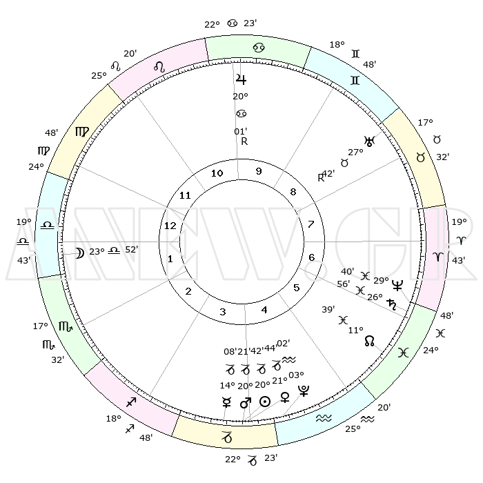 | | ΘΕΣΕΙΣ ΠΛΑΝΗΤΩΝ ΑΣΤΡΟΛΟΓΙΚΟΥ ΧΑΡΤΗ ΤΗΣ ΣΤΙΓΜΗΣ ΑΥΤΗΣ | | | | Πλανήτης | Ζώδιο | Μοίρες | Δεκαήμ. | Σε οίκο | Απόκλιση | | Ακμές των οίκων | | Ηλιος | Αιγόκερως | 20°01' | Τρίτο | 12 | 21 S 56 | | 1ος | 04°44' | Υδροχόος | | Σελήνη | Ζυγός | 15°45' | Δεύτερο | 8 | 08 S 57 | | 2ος | 19°32' | Ιχθείς | | Ερμής | Αιγόκερως | 13°04' | Δεύτερο | 12 | 24 S 15 | | 3ος | 27°12' | Κριός | | Αφροδίτη | Αιγόκερως | 20°53' | Τρίτο | 12 | 22 S 38 | | 4ος | 24°52' | Ταύρος | | Αρης | Αιγόκερως | 19°50' | Δεύτερο | 12 | 22 S 54 | | 5ος | 17°19' | Δίδυμοι | | Δίας | Καρκίνος | 20°07'R | Τρίτο | 6 | 22 N 11 | | 6ος | 08°56' | Καρκίνος | | Κρόνος | Ιχθείς | 26°53' | Τρίτο | 2 | 03 S 17 | | 7ος | 04°44' | Λέων | | Ουρανός | Ταύρος | 27°43'R | Τρίτο | 4 | 19 N 27 | | 8ος | 19°32' | Παρθένος | | Ποσειδώνας | Ιχθείς | 29°39' | Τρίτο | 2 | 01 S 21 | | 9ος | 27°12' | Ζυγός | | Πλούτωνας | Υδροχόος | 03°01' | Πρώτο | 12 | 23 S 10 | | 10ος | 24°52' | Σκορπιός | | Β. Δεσμός | Ιχθείς | 11°41' | Δεύτερο | 1 | 07 S 11 | | 11ος | 17°19' | Τοξότης | | Ωροσκόπος | Υδροχόος | 04°44' | Πρώτο | | | 12ος | 08°56' | Αιγόκερως | | Μεσουράνημα | Σκορπιός | 24°52' | Τρίτο | | | |