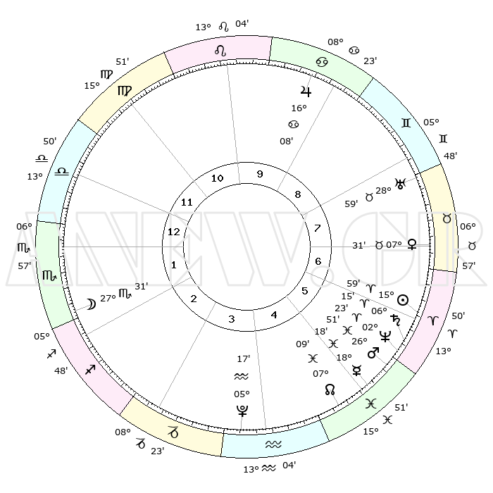 | | ΘΕΣΕΙΣ ΠΛΑΝΗΤΩΝ ΑΣΤΡΟΛΟΓΙΚΟΥ ΧΑΡΤΗ ΤΗΣ ΣΤΙΓΜΗΣ ΑΥΤΗΣ | | | | Πλανήτης | Ζώδιο | Μοίρες | Δεκαήμ. | Σε οίκο | Απόκλιση | | Ακμές των οίκων | | Ηλιος | Κριός | 15°55' | Δεύτερο | 6 | 06 N 16 | | 1ος | 17°06' | Ζυγός | | Σελήνη | Σκορπιός | 26°42' | Τρίτο | 2 | 24 S 20 | | 2ος | 14°47' | Σκορπιός | | Ερμής | Ιχθείς | 18°14' | Δεύτερο | 5 | 06 S 26 | | 3ος | 15°55' | Τοξότης | | Αφροδίτη | Ταύρος | 07°26' | Πρώτο | 7 | 13 N 45 | | 4ος | 19°22' | Αιγόκερως | | Αρης | Ιχθείς | 26°48' | Τρίτο | 6 | 02 S 13 | | 5ος | 22°19' | Υδροχόος | | Δίας | Καρκίνος | 16°07' | Δεύτερο | 9 | 22 N 50 | | 6ος | 21°57' | Ιχθείς | | Κρόνος | Κριός | 06°15' | Πρώτο | 6 | 00 N 31 | | 7ος | 17°06' | Κριός | | Ουρανός | Ταύρος | 28°59' | Τρίτο | 8 | 19 N 45 | | 8ος | 14°47' | Ταύρος | | Ποσειδώνας | Κριός | 02°23' | Πρώτο | 6 | 00 S 15 | | 9ος | 15°55' | Δίδυμοι | | Πλούτωνας | Υδροχόος | 05°17' | Πρώτο | 4 | 22 S 47 | | 10ος | 19°22' | Καρκίνος | | Β. Δεσμός | Ιχθείς | 07°09' | Πρώτο | 5 | 08 S 53 | | 11ος | 22°19' | Λέων | | Ωροσκόπος | Ζυγός | 17°06' | Δεύτερο | | | 12ος | 21°57' | Παρθένος | | Μεσουράνημα | Καρκίνος | 19°22' | Δεύτερο | | | |