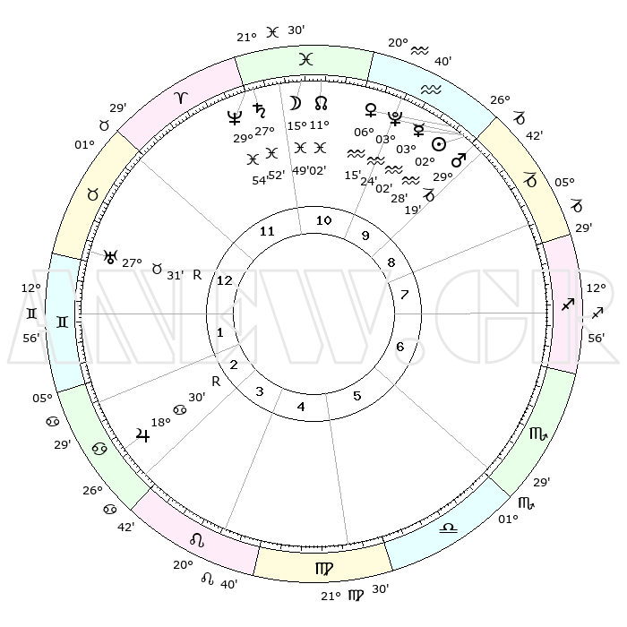 | | ΘΕΣΕΙΣ ΠΛΑΝΗΤΩΝ ΑΣΤΡΟΛΟΓΙΚΟΥ ΧΑΡΤΗ ΤΗΣ ΣΤΙΓΜΗΣ ΑΥΤΗΣ | | | | Πλανήτης | Ζώδιο | Μοίρες | Δεκαήμ. | Σε οίκο | Απόκλιση | | Ακμές των οίκων | | Ηλιος | Υδροχόος | 02°24' | Πρώτο | 10 | 19 S 37 | | 1ος | 13°38' | Ταύρος | | Σελήνη | Ιχθείς | 14°55' | Δεύτερο | 11 | 05 S 29 | | 2ος | 12°13' | Δίδυμοι | | Ερμής | Υδροχόος | 02°55' | Πρώτο | 10 | 21 S 31 | | 3ος | 04°33' | Καρκίνος | | Αφροδίτη | Υδροχόος | 06°10' | Πρώτο | 10 | 19 S 52 | | 4ος | 26°28' | Καρκίνος | | Αρης | Αιγόκερως | 29°16' | Τρίτο | 10 | 21 S 17 | | 5ος | 22°26' | Λέων | | Δίας | Καρκίνος | 18°30'R | Δεύτερο | 3 | 22 N 26 | | 6ος | 27°53' | Παρθένος | | Κρόνος | Ιχθείς | 27°52' | Τρίτο | 11 | 02 S 52 | | 7ος | 13°38' | Σκορπιός | | Ουρανός | Ταύρος | 27°32'R | Τρίτο | 1 | 19 N 25 | | 8ος | 12°13' | Τοξότης | | Ποσειδώνας | Ιχθείς | 29°54' | Τρίτο | 12 | 01 S 15 | | 9ος | 04°33' | Αιγόκερως | | Πλούτωνας | Υδροχόος | 03°24' | Πρώτο | 10 | 23 S 05 | | 10ος | 26°28' | Αιγόκερως | | Β. Δεσμός | Ιχθείς | 11°02' | Δεύτερο | 11 | 07 S 26 | | 11ος | 22°26' | Υδροχόος | | Ωροσκόπος | Ταύρος | 13°38' | Δεύτερο | | | 12ος | 27°53' | Ιχθείς | | Μεσουράνημα | Αιγόκερως | 26°28' | Τρίτο | | | |
