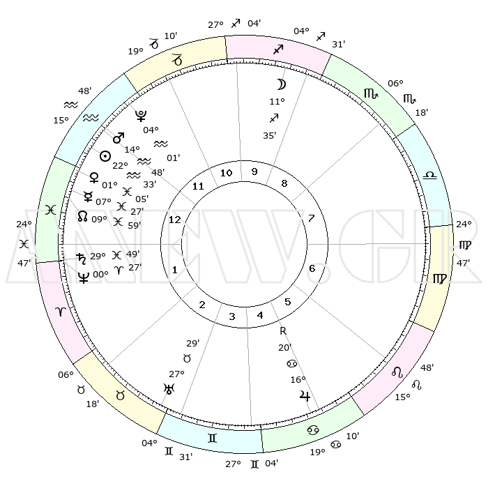 | | ΘΕΣΕΙΣ ΠΛΑΝΗΤΩΝ ΑΣΤΡΟΛΟΓΙΚΟΥ ΧΑΡΤΗ ΤΗΣ ΣΤΙΓΜΗΣ ΑΥΤΗΣ | | | | Πλανήτης | Ζώδιο | Μοίρες | Δεκαήμ. | Σε οίκο | Απόκλιση | | Ακμές των οίκων | | Ηλιος | Υδροχόος | 22°29' | Τρίτο | 1 | 14 S 01 | | 1ος | 20°29' | Υδροχόος | | Σελήνη | Τοξότης | 10°51' | Δεύτερο | 10 | 27 S 16 | | 2ος | 06°18' | Κριός | | Ερμής | Ιχθείς | 07°20' | Πρώτο | 1 | 09 S 28 | | 3ος | 10°55' | Ταύρος | | Αφροδίτη | Ιχθείς | 01°00' | Πρώτο | 1 | 12 S 29 | | 4ος | 06°22' | Δίδυμοι | | Αρης | Υδροχόος | 14°45' | Δεύτερο | 12 | 17 S 26 | | 5ος | 28°10' | Δίδυμοι | | Δίας | Καρκίνος | 16°20'R | Δεύτερο | 5 | 22 N 45 | | 6ος | 20°51' | Καρκίνος | | Κρόνος | Ιχθείς | 29°49' | Τρίτο | 1 | 02 S 03 | | 7ος | 20°29' | Λέων | | Ουρανός | Ταύρος | 27°29' | Τρίτο | 3 | 19 N 25 | | 8ος | 06°18' | Ζυγός | | Ποσειδώνας | Κριός | 00°27' | Πρώτο | 1 | 01 S 02 | | 9ος | 10°55' | Σκορπιός | | Πλούτωνας | Υδροχόος | 04°01' | Πρώτο | 12 | 22 S 58 | | 10ος | 06°22' | Τοξότης | | Β. Δεσμός | Ιχθείς | 09°59' | Πρώτο | 1 | 07 S 49 | | 11ος | 28°10' | Τοξότης | | Ωροσκόπος | Υδροχόος | 20°29' | Τρίτο | | | 12ος | 20°51' | Αιγόκερως | | Μεσουράνημα | Τοξότης | 06°22' | Πρώτο | | | |