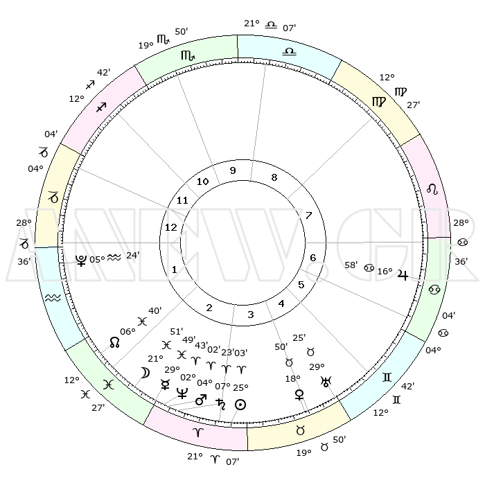 | | ΘΕΣΕΙΣ ΠΛΑΝΗΤΩΝ ΑΣΤΡΟΛΟΓΙΚΟΥ ΧΑΡΤΗ ΤΗΣ ΣΤΙΓΜΗΣ ΑΥΤΗΣ | | | | Πλανήτης | Ζώδιο | Μοίρες | Δεκαήμ. | Σε οίκο | Απόκλιση | | Ακμές των οίκων | | Ηλιος | Κριός | 24°60' | Τρίτο | 3 | 09 N 40 | | 1ος | 07°52' | Αιγόκερως | | Σελήνη | Ιχθείς | 21°07' | Τρίτο | 2 | 02 S 27 | | 2ος | 17°02' | Υδροχόος | | Ερμής | Ιχθείς | 29°44' | Τρίτο | 3 | 02 S 29 | | 3ος | 27°20' | Ιχθείς | | Αφροδίτη | Ταύρος | 18°46' | Δεύτερο | 4 | 17 N 34 | | 4ος | 29°55' | Κριός | | Αρης | Κριός | 03°60' | Πρώτο | 3 | 00 N 41 | | 5ος | 25°03' | Ταύρος | | Δίας | Καρκίνος | 16°58' | Δεύτερο | 7 | 22 N 44 | | 6ος | 16°27' | Δίδυμοι | | Κρόνος | Κριός | 07°23' | Πρώτο | 3 | 00 N 57 | | 7ος | 07°52' | Καρκίνος | | Ουρανός | Ταύρος | 29°25' | Τρίτο | 5 | 19 N 51 | | 8ος | 17°02' | Λέων | | Ποσειδώνας | Κριός | 02°43' | Πρώτο | 3 | 00 S 07 | | 9ος | 27°20' | Παρθένος | | Πλούτωνας | Υδροχόος | 05°24' | Πρώτο | 1 | 22 S 47 | | 10ος | 29°55' | Ζυγός | | Β. Δεσμός | Ιχθείς | 06°40' | Πρώτο | 2 | 09 S 04 | | 11ος | 25°03' | Σκορπιός | | Ωροσκόπος | Αιγόκερως | 07°52' | Πρώτο | | | 12ος | 16°27' | Τοξότης | | Μεσουράνημα | Ζυγός | 29°55' | Τρίτο | | | |