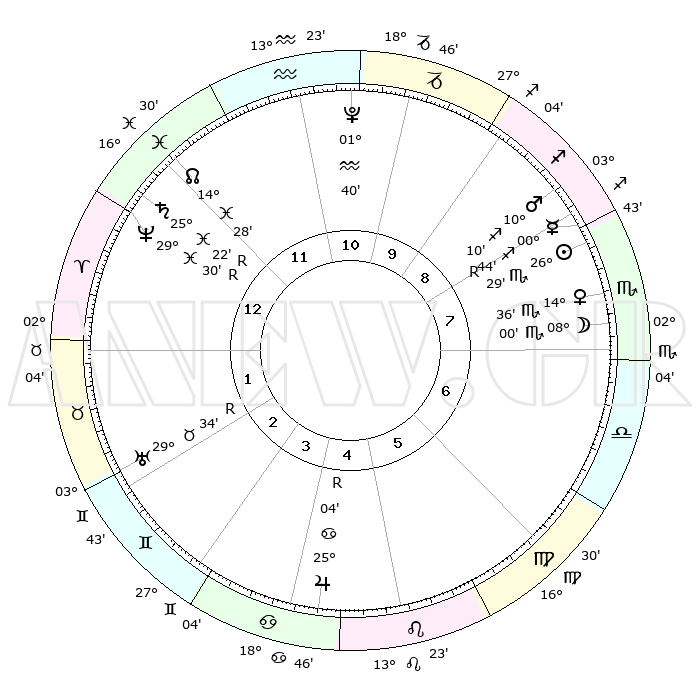 | | ΘΕΣΕΙΣ ΠΛΑΝΗΤΩΝ ΑΣΤΡΟΛΟΓΙΚΟΥ ΧΑΡΤΗ ΤΗΣ ΣΤΙΓΜΗΣ ΑΥΤΗΣ | | | | Πλανήτης | Ζώδιο | Μοίρες | Δεκαήμ. | Σε οίκο | Απόκλιση | | Ακμές των οίκων | | Ηλιος | Σκορπιός | 26°25' | Τρίτο | 8 | 19 S 21 | | 1ος | 26°21' | Ιχθείς | | Σελήνη | Σκορπιός | 07°16' | Πρώτο | 7 | 17 S 39 | | 2ος | 07°30' | Ταύρος | | Ερμής | Τοξότης | 00°49'R | Πρώτο | 8 | 20 S 25 | | 3ος | 05°28' | Δίδυμοι | | Αφροδίτη | Σκορπιός | 14°32' | Δεύτερο | 8 | 15 S 08 | | 4ος | 27°57' | Δίδυμοι | | Αρης | Τοξότης | 10°07' | Δεύτερο | 9 | 22 S 31 | | 5ος | 20°06' | Καρκίνος | | Δίας | Καρκίνος | 25°04'R | Τρίτο | 5 | 21 N 14 | | 6ος | 16°57' | Λέων | | Κρόνος | Ιχθείς | 25°22'R | Τρίτο | 12 | 04 S 03 | | 7ος | 26°21' | Παρθένος | | Ουρανός | Ταύρος | 29°34'R | Τρίτο | 2 | 19 N 51 | | 8ος | 07°30' | Σκορπιός | | Ποσειδώνας | Ιχθείς | 29°30'R | Τρίτο | 1 | 01 S 27 | | 9ος | 05°28' | Τοξότης | | Πλούτωνας | Υδροχόος | 01°40' | Πρώτο | 11 | 23 S 27 | | 10ος | 27°57' | Τοξότης | | Β. Δεσμός | Ιχθείς | 14°28' | Δεύτερο | 12 | 06 S 07 | | 11ος | 20°06' | Αιγόκερως | | Ωροσκόπος | Ιχθείς | 26°21' | Τρίτο | | | 12ος | 16°57' | Υδροχόος | | Μεσουράνημα | Τοξότης | 27°57' | Τρίτο | | | |