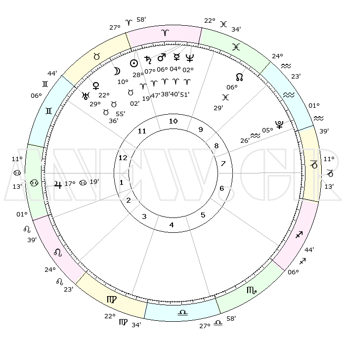 | | ΘΕΣΕΙΣ ΠΛΑΝΗΤΩΝ ΑΣΤΡΟΛΟΓΙΚΟΥ ΧΑΡΤΗ ΤΗΣ ΣΤΙΓΜΗΣ ΑΥΤΗΣ | | | | Πλανήτης | Ζώδιο | Μοίρες | Δεκαήμ. | Σε οίκο | Απόκλιση | | Ακμές των οίκων | | Ηλιος | Κριός | 28°15' | Τρίτο | 11 | 10 N 51 | | 1ος | 19°07' | Δίδυμοι | | Σελήνη | Ταύρος | 09°02' | Πρώτο | 11 | 18 N 45 | | 2ος | 10°52' | Καρκίνος | | Ερμής | Κριός | 04°34' | Πρώτο | 11 | 00 S 36 | | 3ος | 02°10' | Λέων | | Αφροδίτη | Ταύρος | 22°50' | Τρίτο | 12 | 18 N 47 | | 4ος | 26°53' | Λέων | | Αρης | Κριός | 06°35' | Πρώτο | 11 | 01 N 43 | | 5ος | 28°54' | Παρθένος | | Δίας | Καρκίνος | 17°19' | Δεύτερο | 2 | 22 N 41 | | 6ος | 09°11' | Σκορπιός | | Κρόνος | Κριός | 07°47' | Πρώτο | 11 | 01 N 07 | | 7ος | 19°07' | Τοξότης | | Ουρανός | Ταύρος | 29°35' | Τρίτο | 12 | 19 N 54 | | 8ος | 10°52' | Αιγόκερως | | Ποσειδώνας | Κριός | 02°50' | Πρώτο | 11 | 00 S 05 | | 9ος | 02°10' | Υδροχόος | | Πλούτωνας | Υδροχόος | 05°26' | Πρώτο | 9 | 22 S 47 | | 10ος | 26°53' | Υδροχόος | | Β. Δεσμός | Ιχθείς | 06°29' | Πρώτο | 10 | 09 S 08 | | 11ος | 28°54' | Ιχθείς | | Ωροσκόπος | Δίδυμοι | 19°07' | Δεύτερο | | | 12ος | 09°11' | Ταύρος | | Μεσουράνημα | Υδροχόος | 26°53' | Τρίτο | | | |