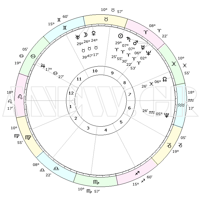 | | ΘΕΣΕΙΣ ΠΛΑΝΗΤΩΝ ΑΣΤΡΟΛΟΓΙΚΟΥ ΧΑΡΤΗ ΤΗΣ ΣΤΙΓΜΗΣ ΑΥΤΗΣ | | | | Πλανήτης | Ζώδιο | Μοίρες | Δεκαήμ. | Σε οίκο | Απόκλιση | | Ακμές των οίκων | | Ηλιος | Κριός | 29°21' | Τρίτο | 10 | 11 N 14 | | 1ος | 29°08' | Καρκίνος | | Σελήνη | Ταύρος | 25°48' | Τρίτο | 11 | 24 N 03 | | 2ος | 20°07' | Λέων | | Ερμής | Κριός | 06°16' | Πρώτο | 9 | 00 N 05 | | 3ος | 15°03' | Παρθένος | | Αφροδίτη | Ταύρος | 24°12' | Τρίτο | 11 | 19 N 11 | | 4ος | 15°58' | Ζυγός | | Αρης | Κριός | 07°27' | Πρώτο | 9 | 02 N 04 | | 5ος | 22°02' | Σκορπιός | | Δίας | Καρκίνος | 17°27' | Δεύτερο | 12 | 22 N 41 | | 6ος | 27°53' | Τοξότης | | Κρόνος | Κριός | 07°55' | Πρώτο | 9 | 01 N 10 | | 7ος | 29°08' | Αιγόκερως | | Ουρανός | Ταύρος | 29°39' | Τρίτο | 11 | 19 N 54 | | 8ος | 20°07' | Υδροχόος | | Ποσειδώνας | Κριός | 02°53' | Πρώτο | 9 | 00 S 04 | | 9ος | 15°03' | Ιχθείς | | Πλούτωνας | Υδροχόος | 05°26' | Πρώτο | 7 | 22 S 48 | | 10ος | 15°58' | Κριός | | Β. Δεσμός | Ιχθείς | 06°26' | Πρώτο | 8 | 09 S 09 | | 11ος | 22°02' | Ταύρος | | Ωροσκόπος | Καρκίνος | 29°08' | Τρίτο | | | 12ος | 27°53' | Δίδυμοι | | Μεσουράνημα | Κριός | 15°58' | Δεύτερο | | | |