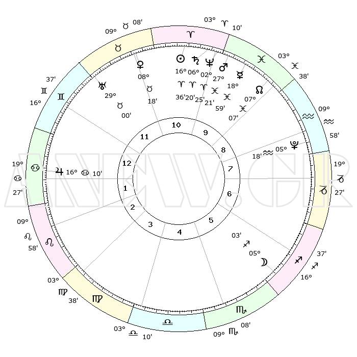 | | ΘΕΣΕΙΣ ΠΛΑΝΗΤΩΝ ΑΣΤΡΟΛΟΓΙΚΟΥ ΧΑΡΤΗ ΤΗΣ ΣΤΙΓΜΗΣ ΑΥΤΗΣ | | | | Πλανήτης | Ζώδιο | Μοίρες | Δεκαήμ. | Σε οίκο | Απόκλιση | | Ακμές των οίκων | | Ηλιος | Κριός | 16°32' | Δεύτερο | 11 | 06 N 30 | | 1ος | 26°21' | Δίδυμοι | | Σελήνη | Τοξότης | 04°10' | Πρώτο | 6 | 26 S 02 | | 2ος | 17°24' | Καρκίνος | | Ερμής | Ιχθείς | 18°55' | Δεύτερο | 10 | 06 S 14 | | 3ος | 08°59' | Λέων | | Αφροδίτη | Ταύρος | 08°12' | Πρώτο | 11 | 14 N 02 | | 4ος | 04°44' | Παρθένος | | Αρης | Ιχθείς | 27°17' | Τρίτο | 10 | 02 S 01 | | 5ος | 08°04' | Ζυγός | | Δίας | Καρκίνος | 16°10' | Δεύτερο | 1 | 22 N 50 | | 6ος | 18°16' | Σκορπιός | | Κρόνος | Κριός | 06°19' | Πρώτο | 10 | 00 N 33 | | 7ος | 26°21' | Τοξότης | | Ουρανός | Ταύρος | 29°00' | Τρίτο | 12 | 19 N 46 | | 8ος | 17°24' | Αιγόκερως | | Ποσειδώνας | Κριός | 02°24' | Πρώτο | 10 | 00 S 15 | | 9ος | 08°59' | Υδροχόος | | Πλούτωνας | Υδροχόος | 05°18' | Πρώτο | 8 | 22 S 47 | | 10ος | 04°44' | Ιχθείς | | Β. Δεσμός | Ιχθείς | 07°07' | Πρώτο | 10 | 08 S 54 | | 11ος | 08°04' | Κριός | | Ωροσκόπος | Δίδυμοι | 26°21' | Τρίτο | | | 12ος | 18°16' | Ταύρος | | Μεσουράνημα | Ιχθείς | 04°44' | Πρώτο | | | |
